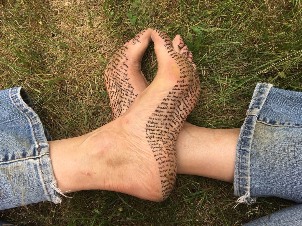 walking, crawling, balancing, creeping, gripping, swaying, crab-walking my way around a rocky point in the Narrows in my bare feet, logging the physical sensations as they occur and later transcribing these onto my skin.