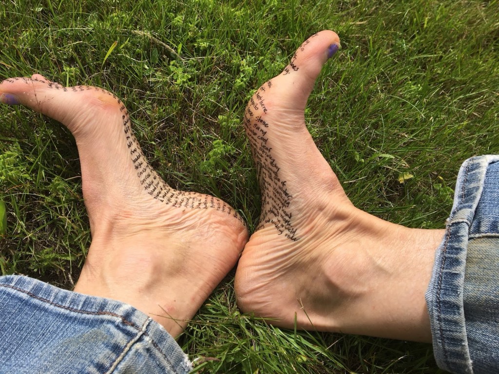 noting that the awkward gymnastics required to write on the soles of my feet created its own set of physical sensations, many of them much less pleasant than the walking itself…