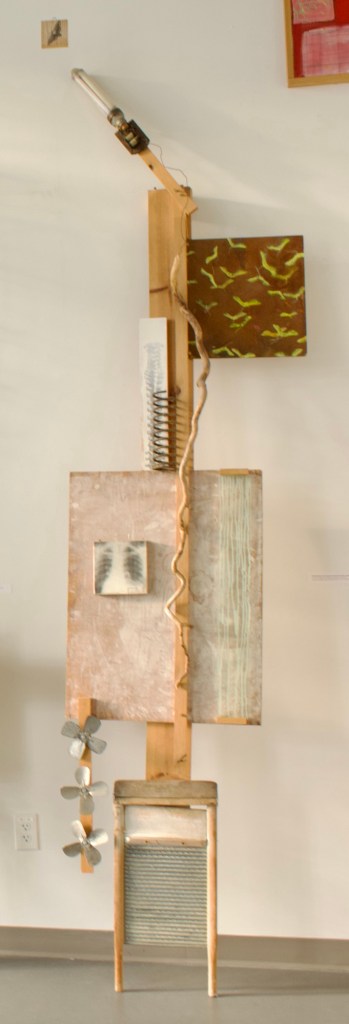 wood, photographs, photocopy transfers, washboard, branch, propellers, glass, paint, light bulb, found materials