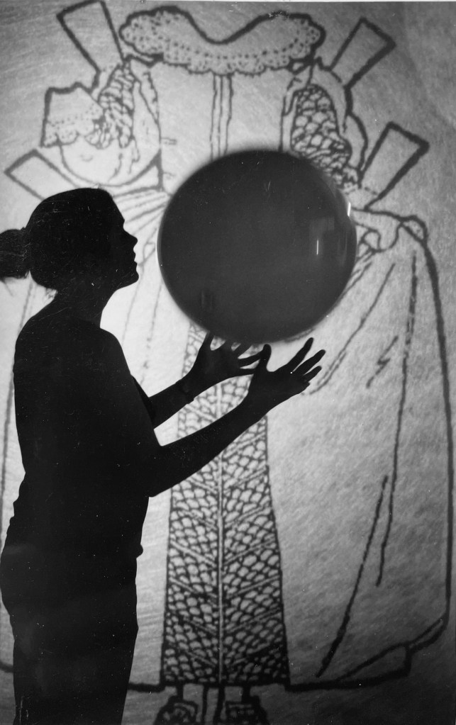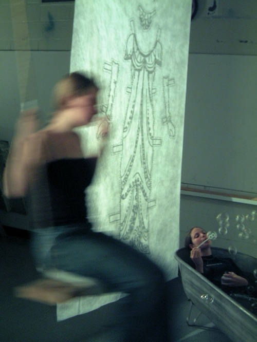 projections on scrims, rubber ball, wooden stool, hairbrush, swing, metal tub, soap bubbles, and spoken word
