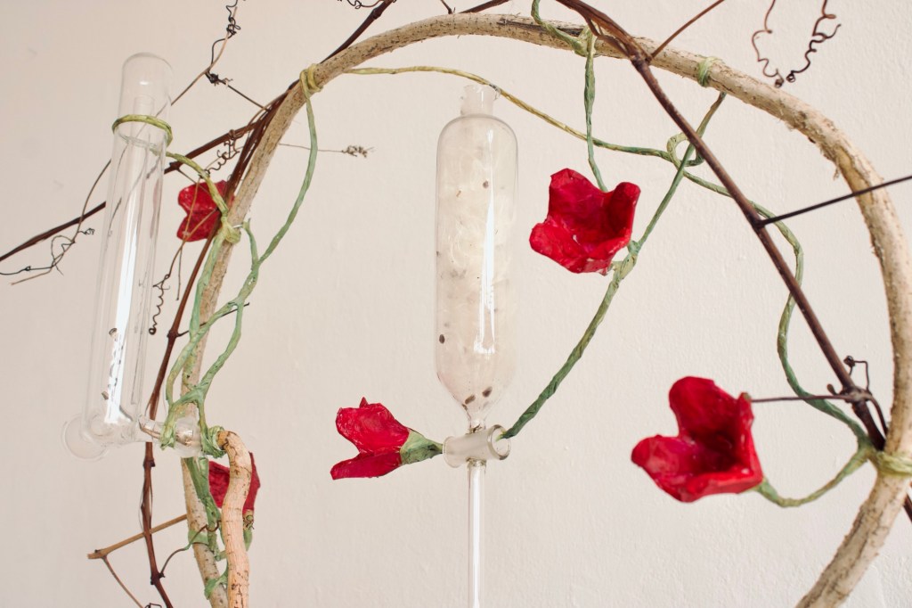 root, vine, glassware, milkweed seeds, quartz from White Mountains, coiled wire from Silver Plume, paper, paint
