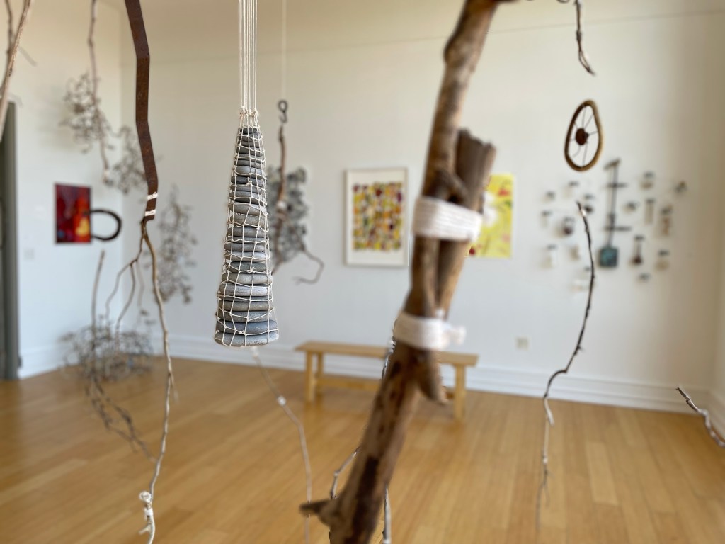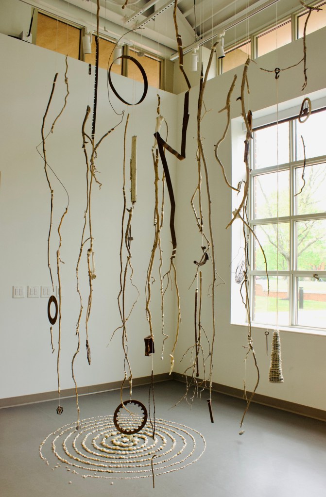 A collection of walking sticks, assembled from natural deadfall and human-made treasures foraged in the woods. They are a selection of beautiful (to me) but unremarkable materials, which I knot and repair with patient, laborious attention. Rusted metal machine parts bear the marks of other lives and other locations, now dislocated to create a new narrative while carrying the ghostlike reference to their old stories. They form a plaintive forest grove, fighting for its life in the Anthropocene.