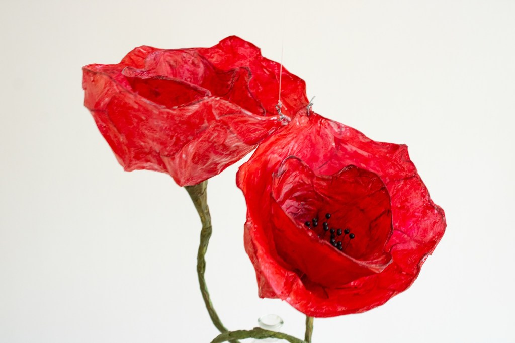 scientific glassware, paper, paint, wire, thread, poppy seeds
