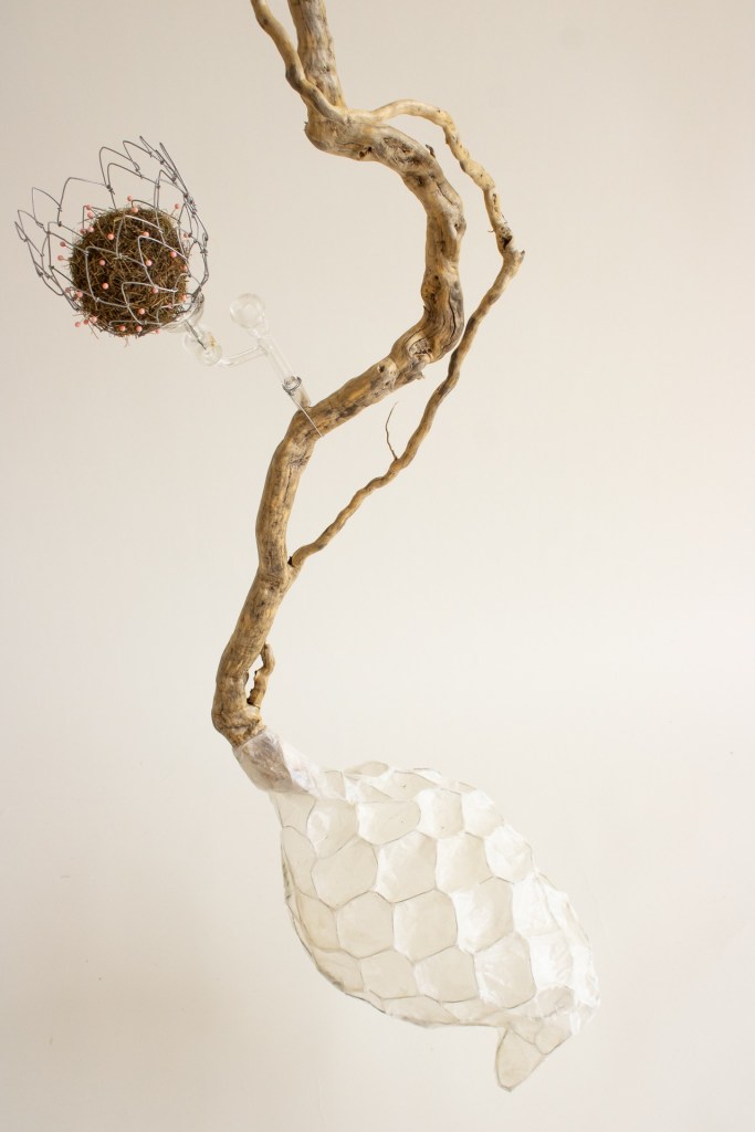 branch, scientific glassware, seaweed, organic grass ball, pins, wire, Joomchi, paper