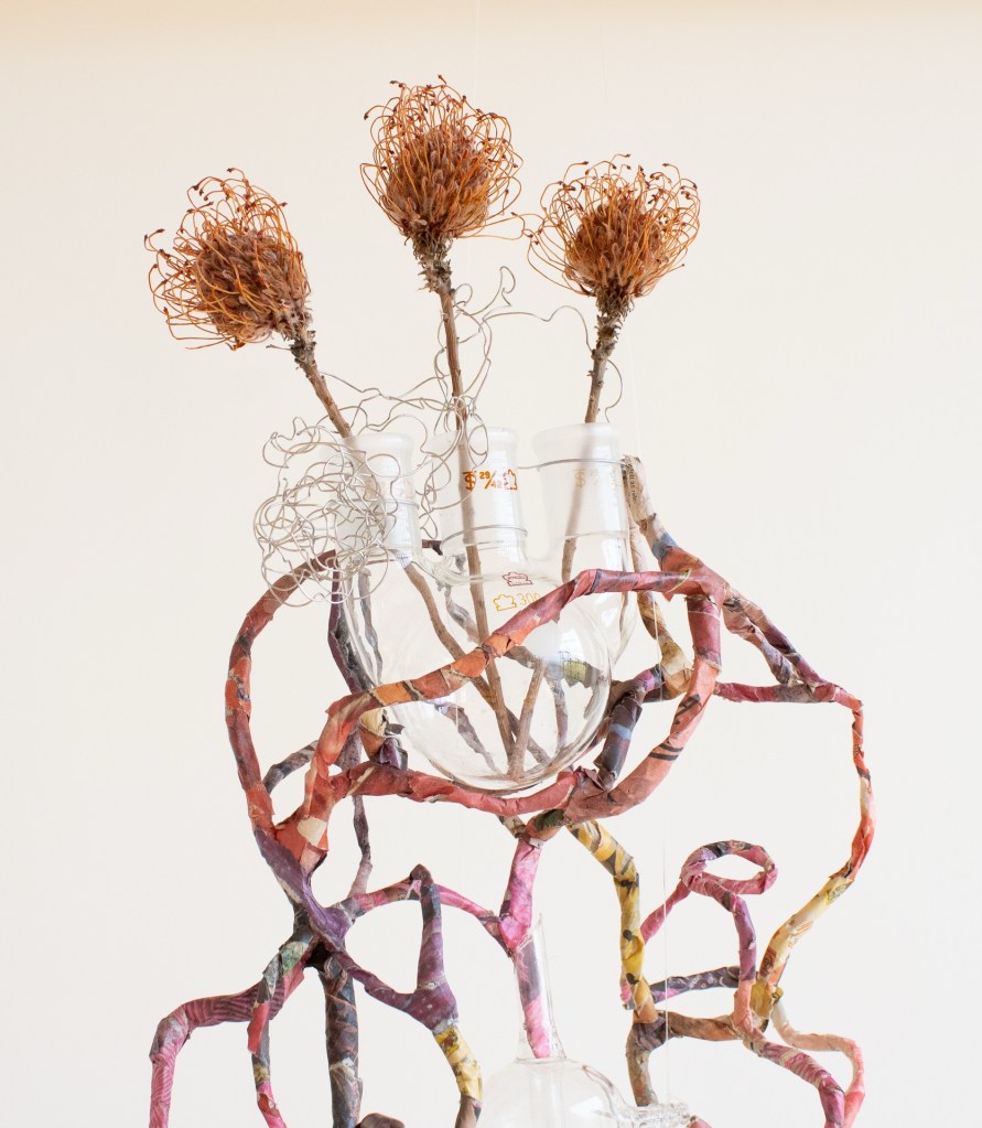 flowers from Austin TX, scientific glassware, paper, wire, root