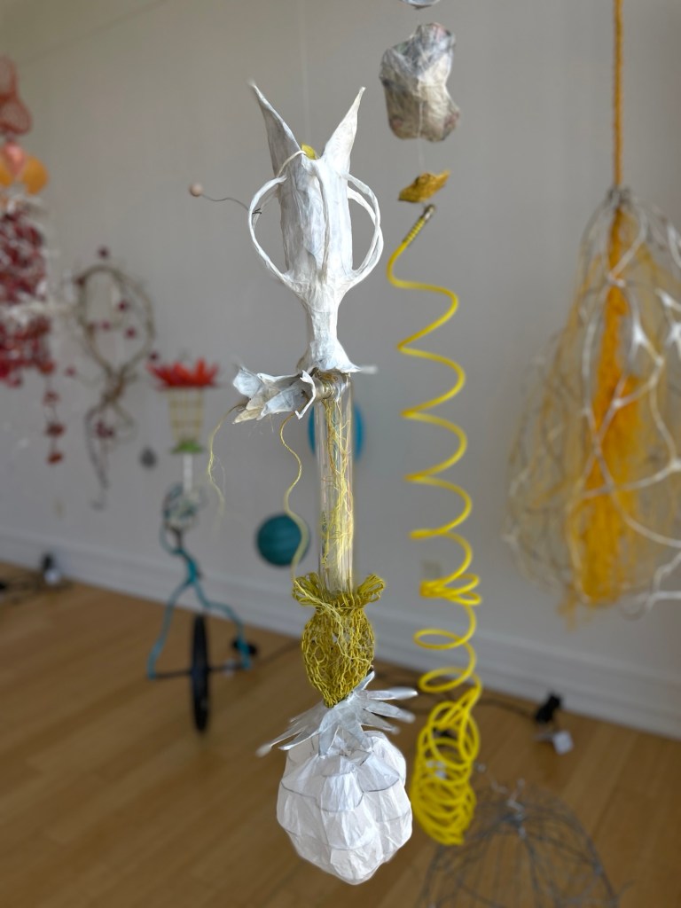 fishing net, scientific glassware, paper, wire, beads