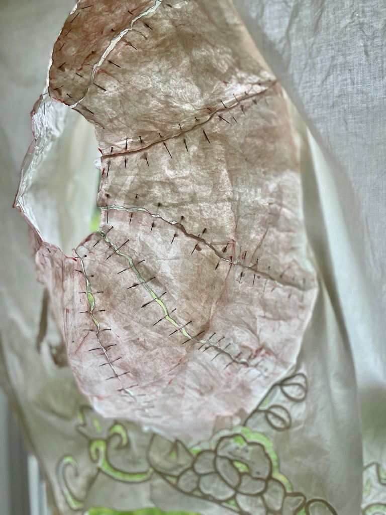 cotton curtain, tracing paper, watercolor, glue, straight pins