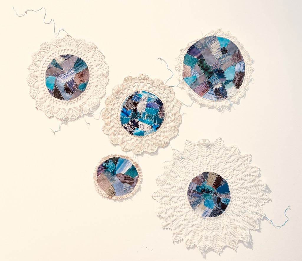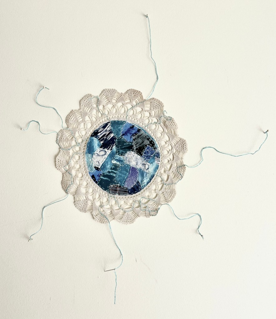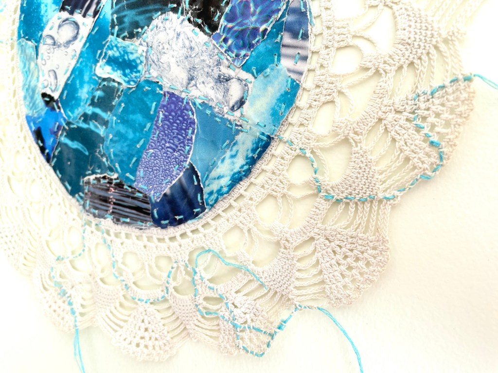 found doilies, magazine photographs, thread