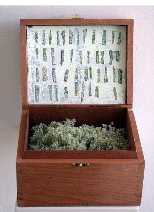 cigar box, lichen, oil paint on paper,