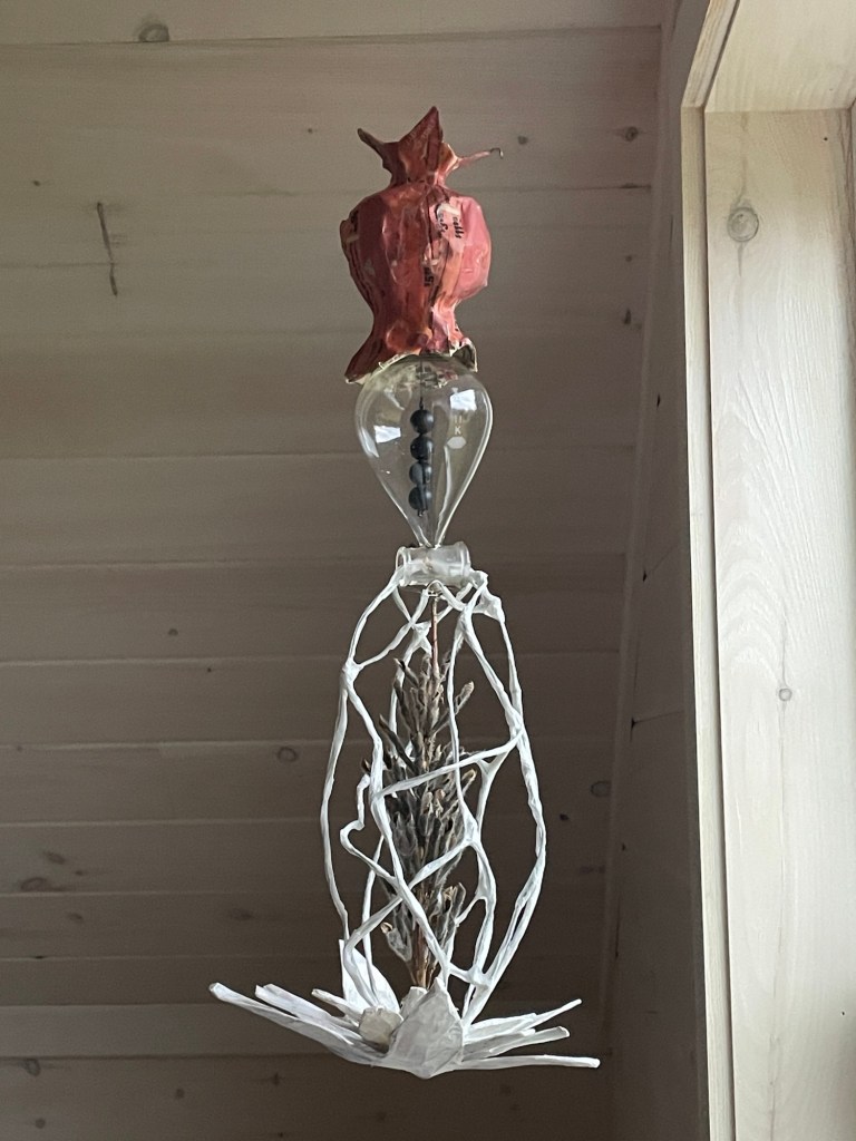 paper, wire, scientific glassware, beads, lupine seeds, paint