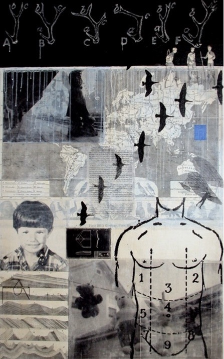 acrylic paint, photographs and transferred photocopies on canvas