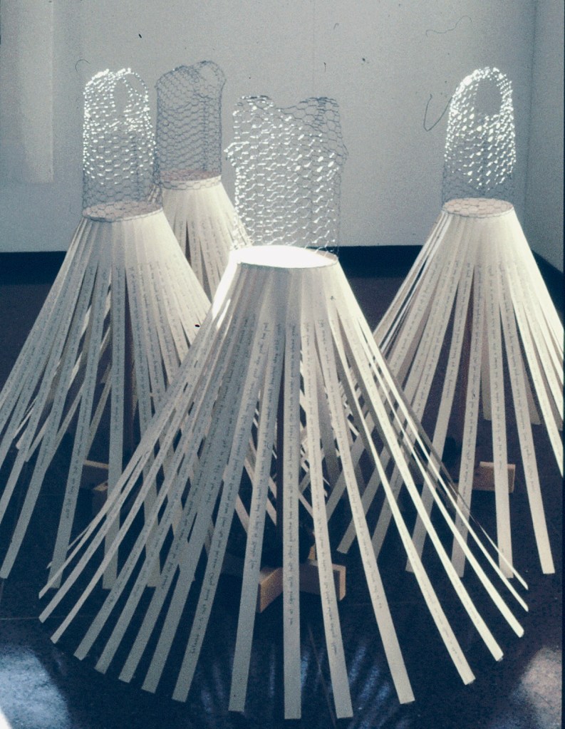 chicken wire, wood, paper, hand-written stories in ink