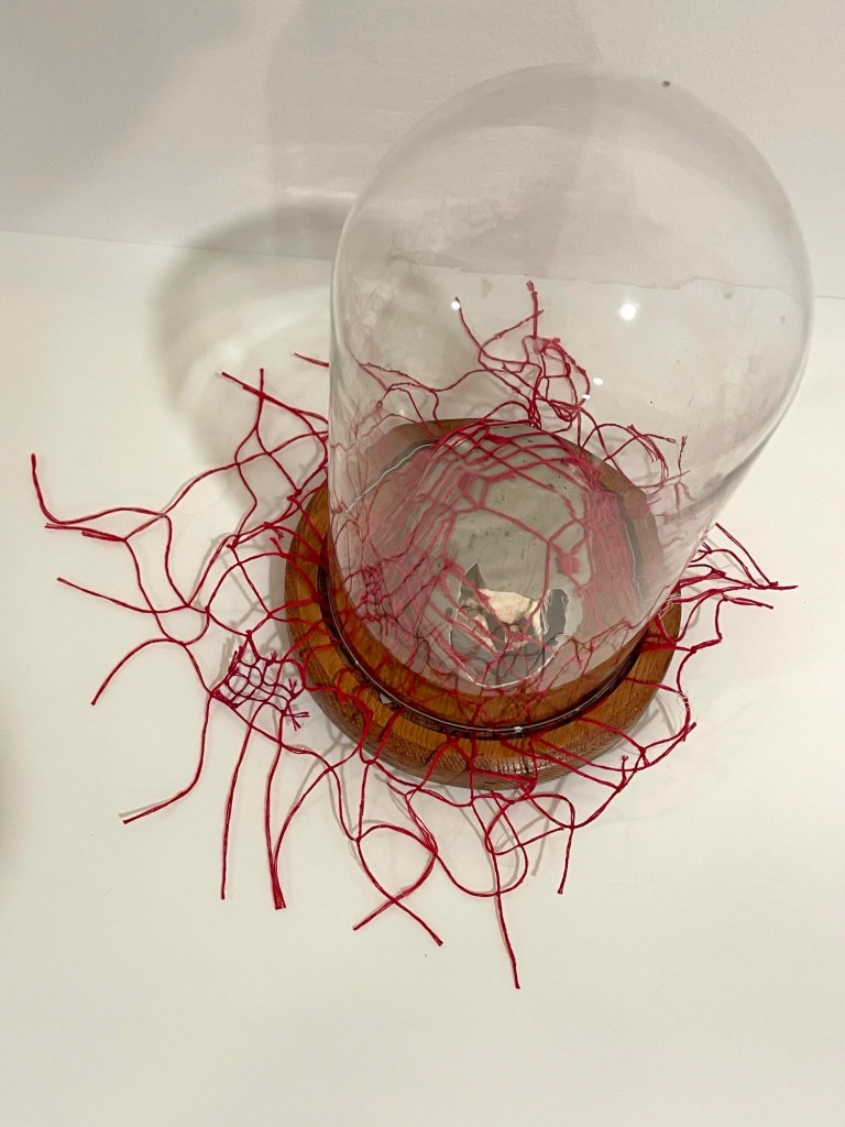 Loon eggshell, hand-knotted embroidery floss, glass cloche