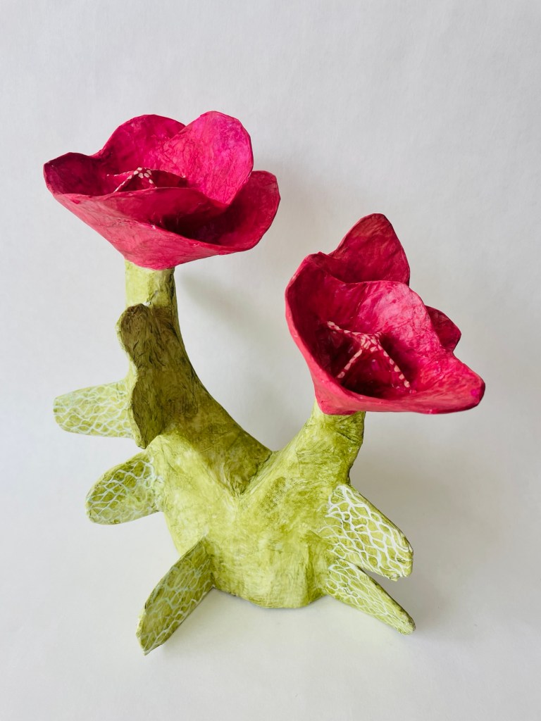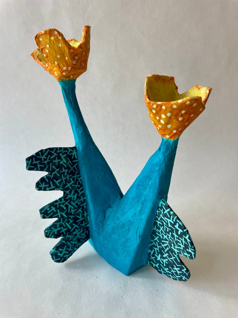 papier mache, watercolor paint, tracing paper, recycled cardboard, wire poultry fencing, wooden beads