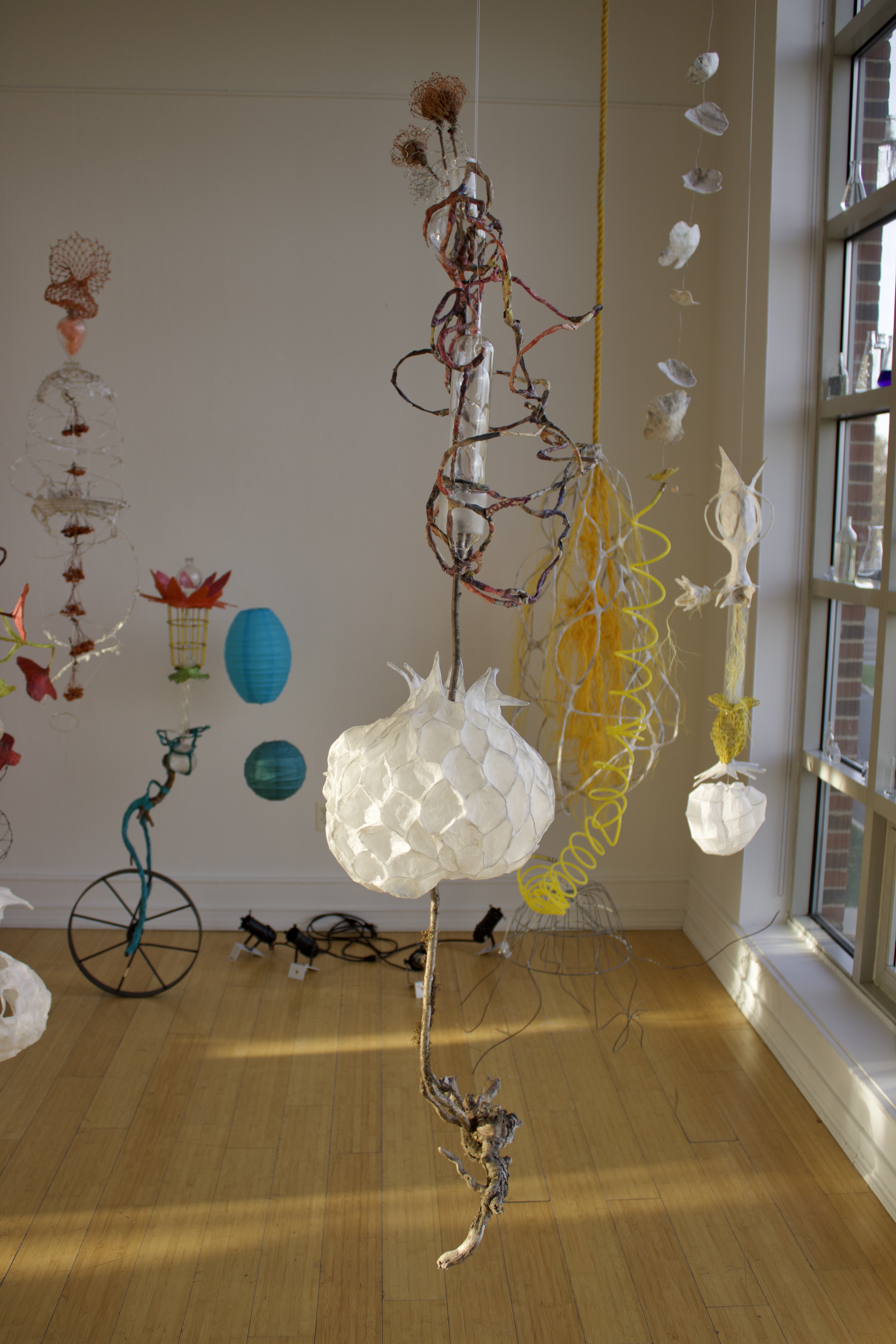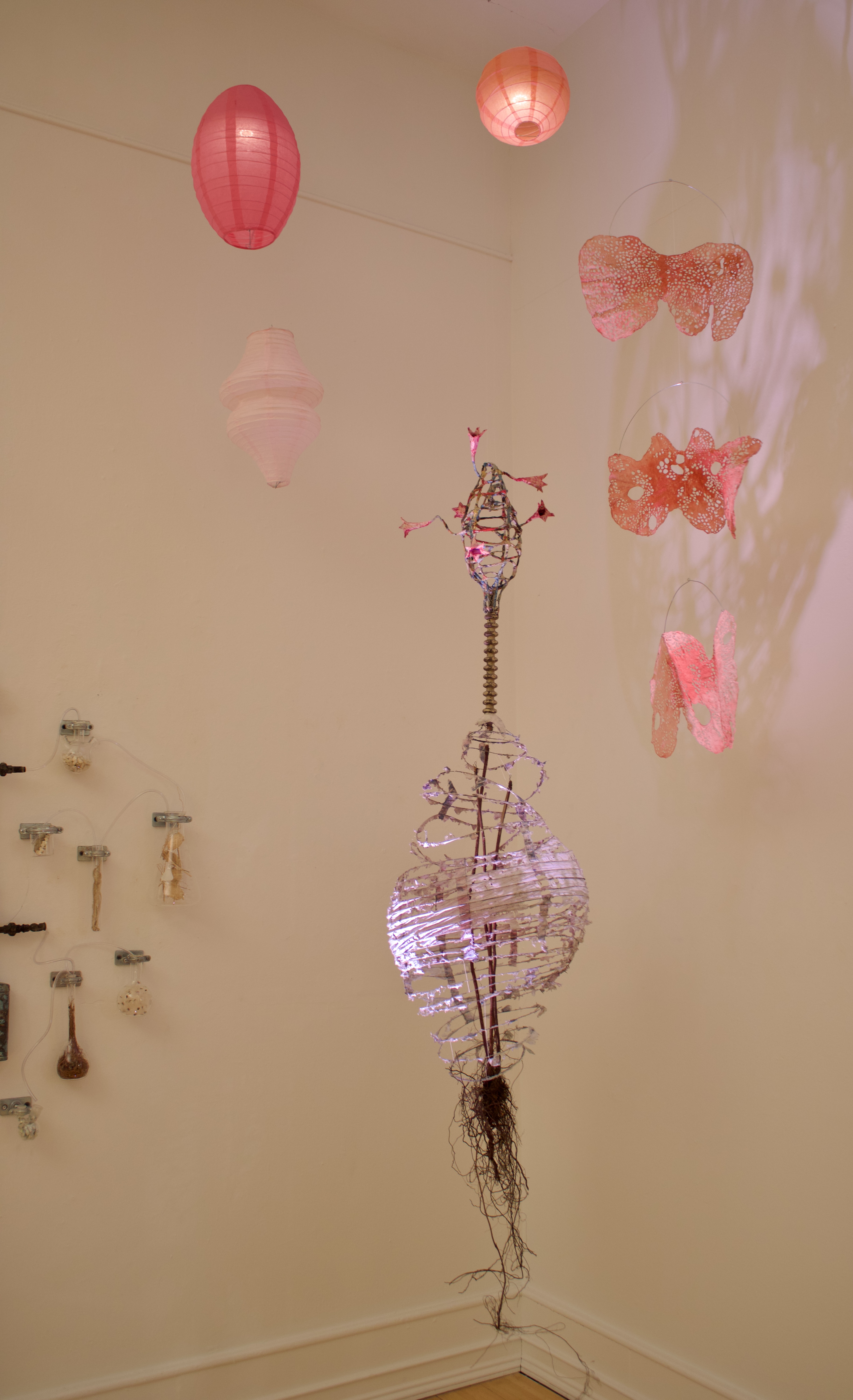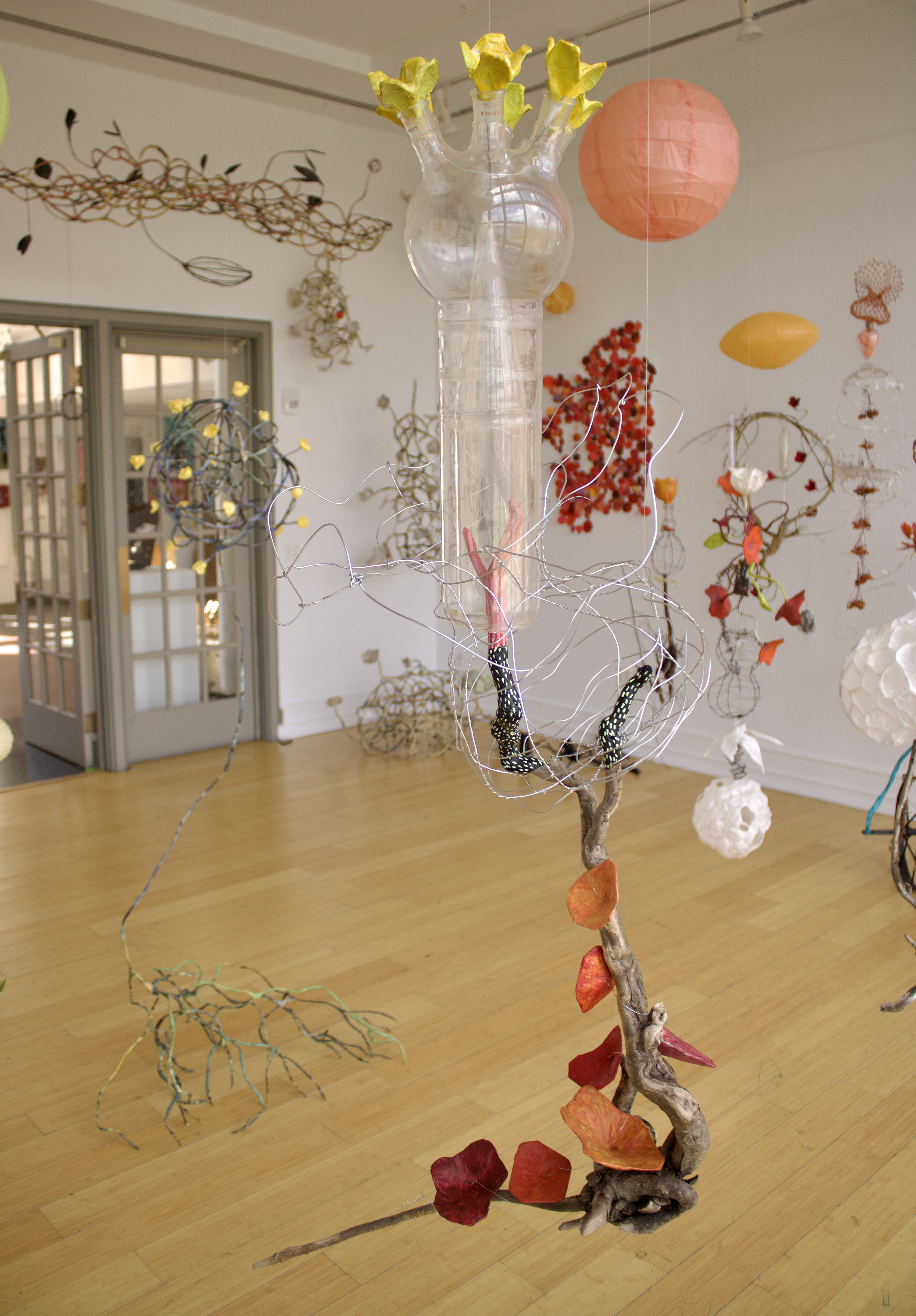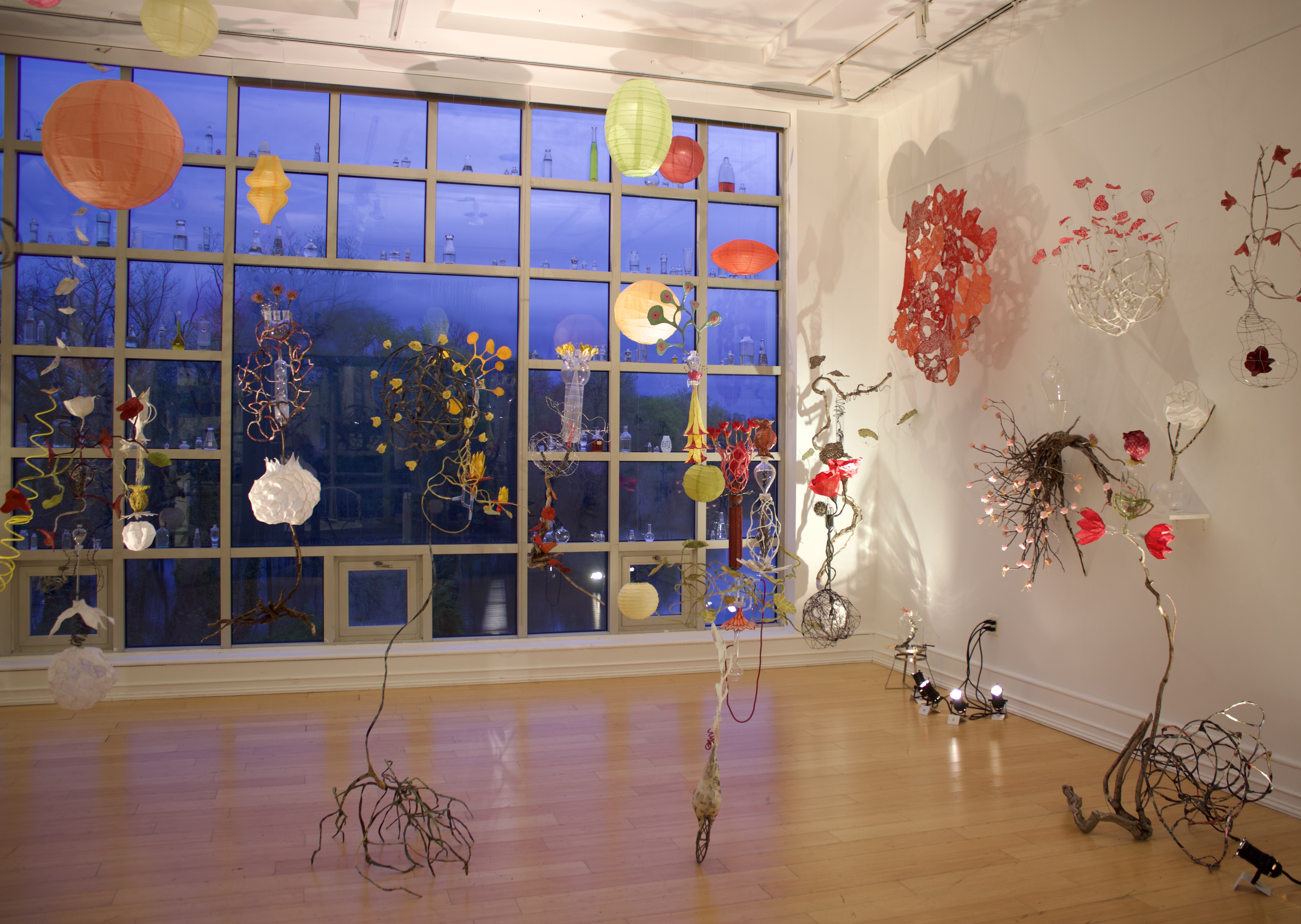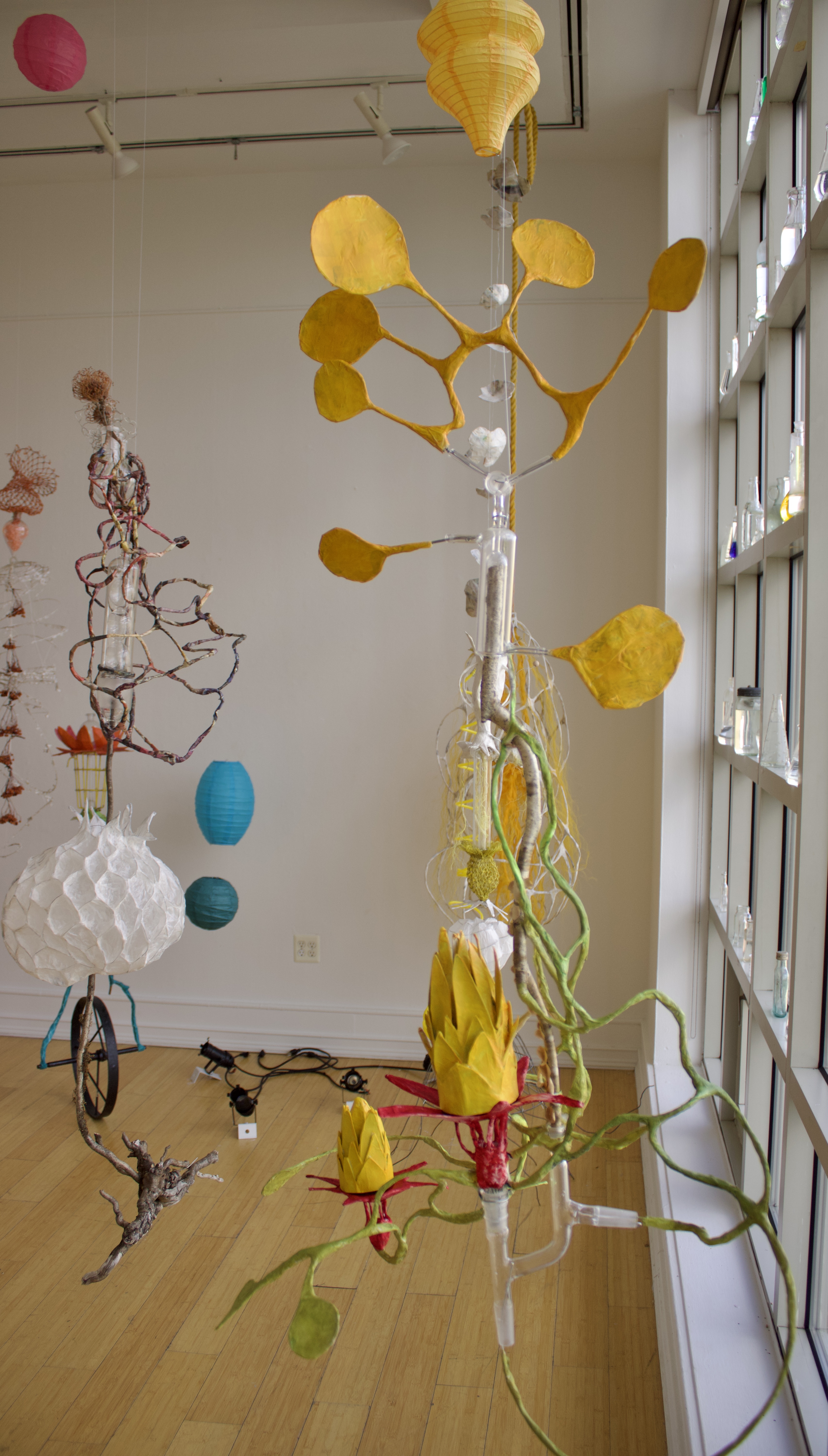 installation of chemistry glassware, water, wire, string, papier-mâché, found objects, paint, plants, paper lanterns, audio