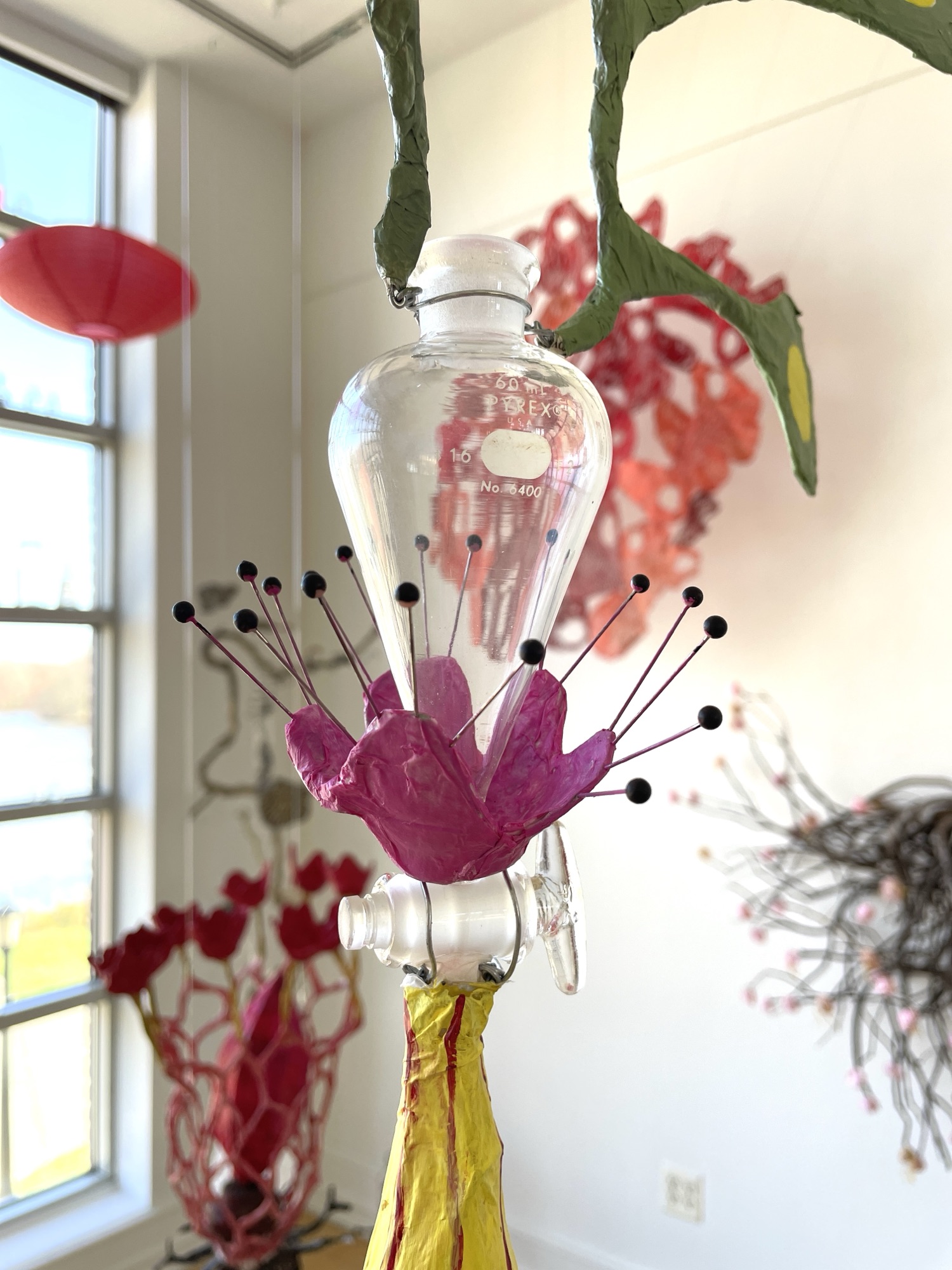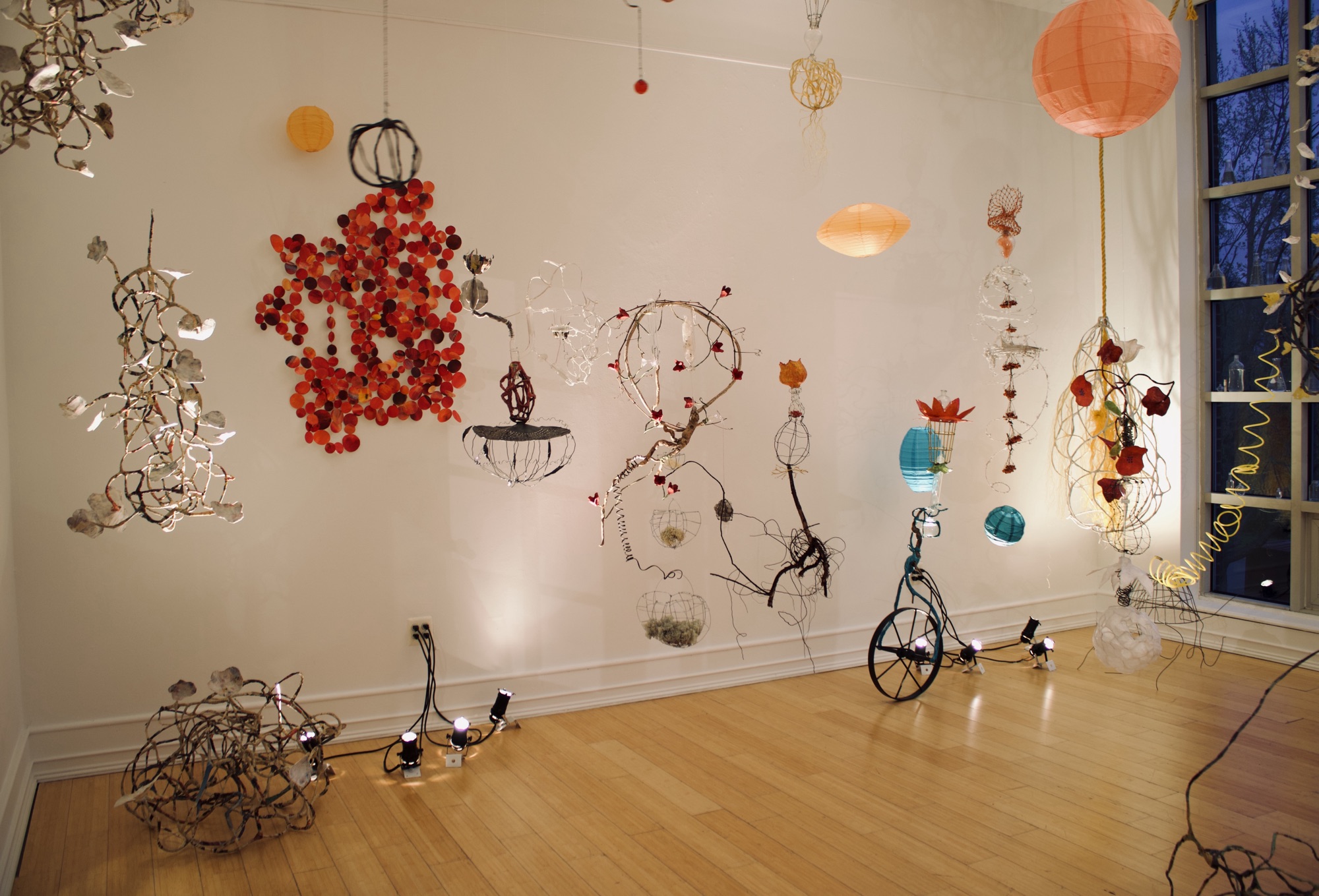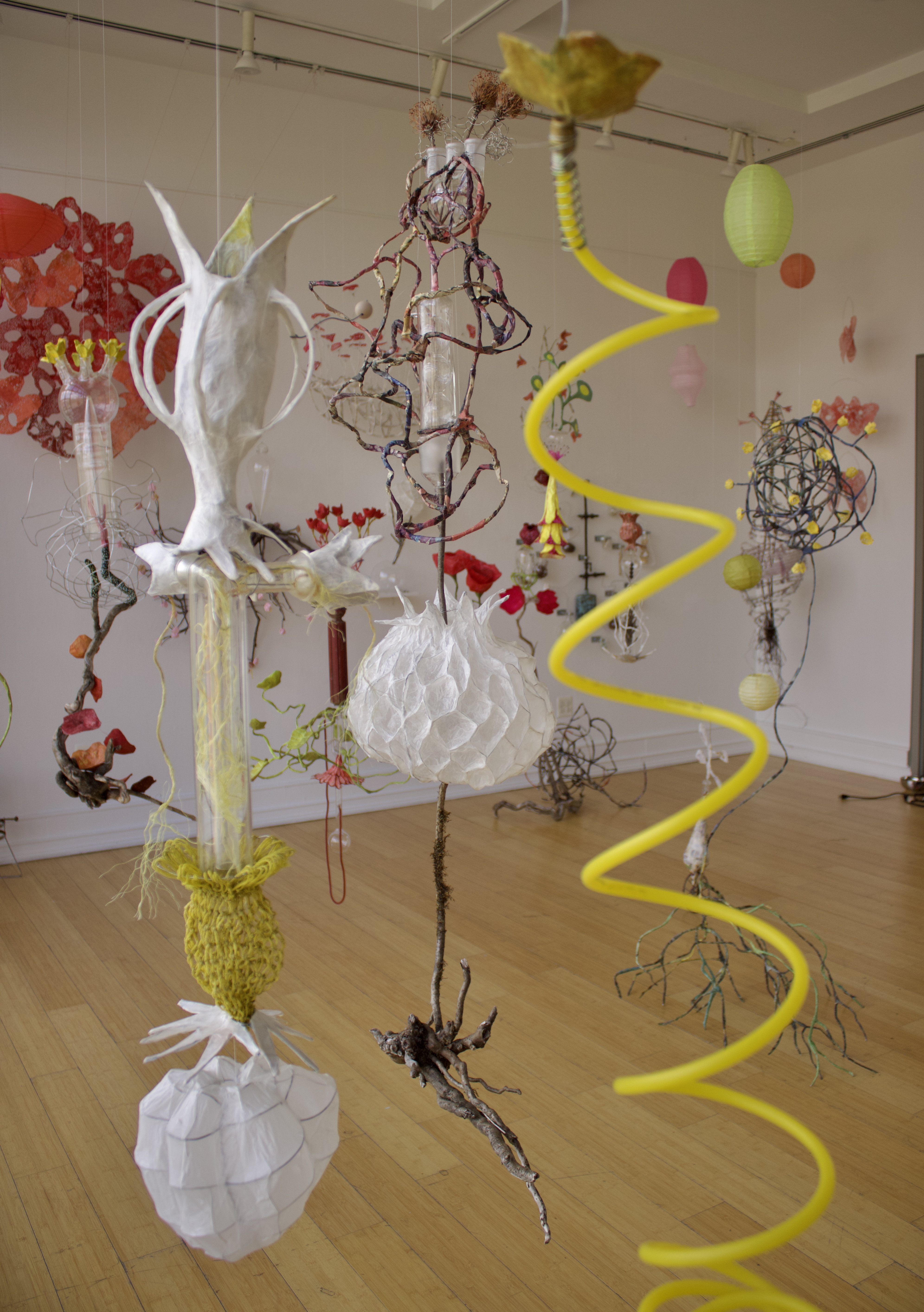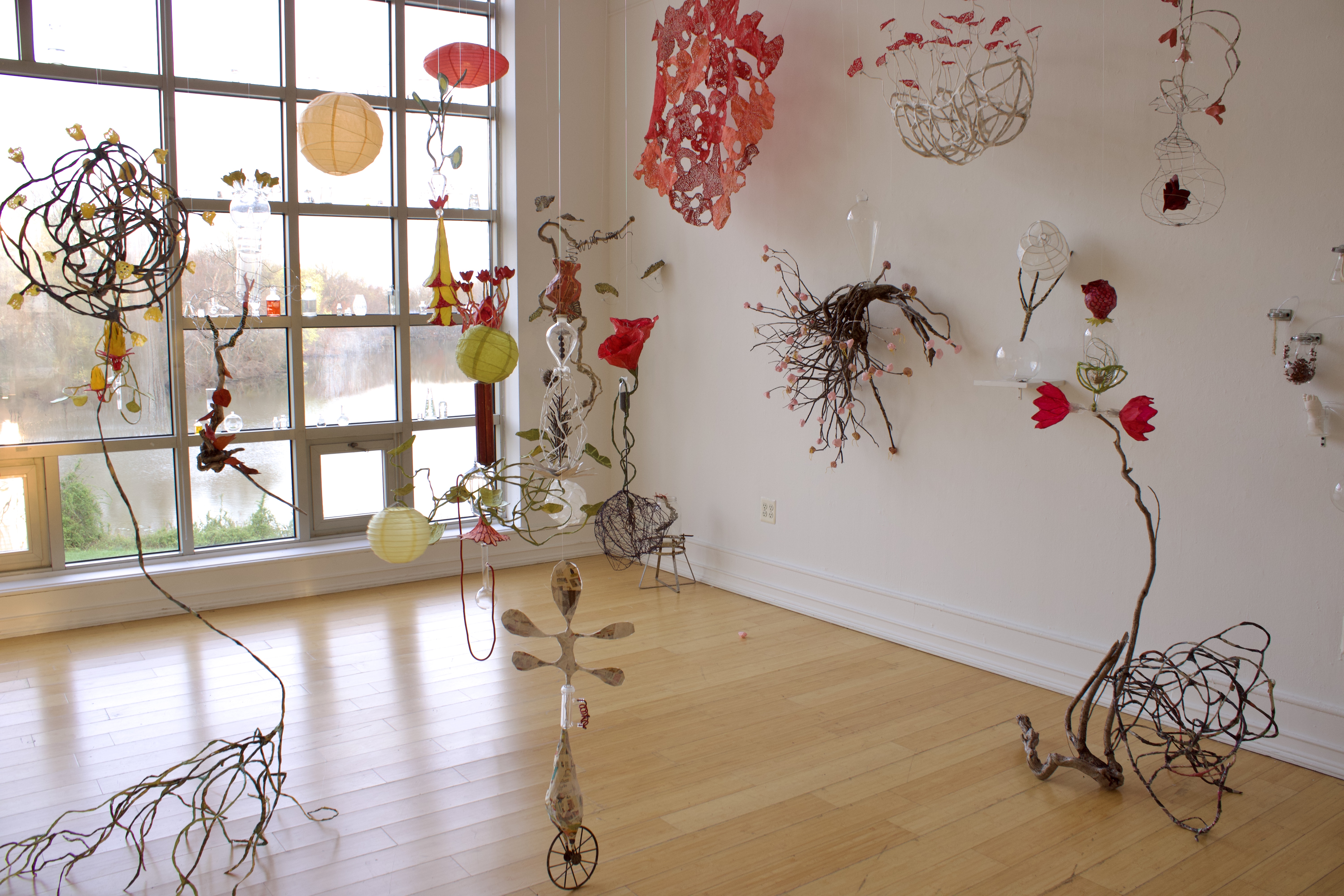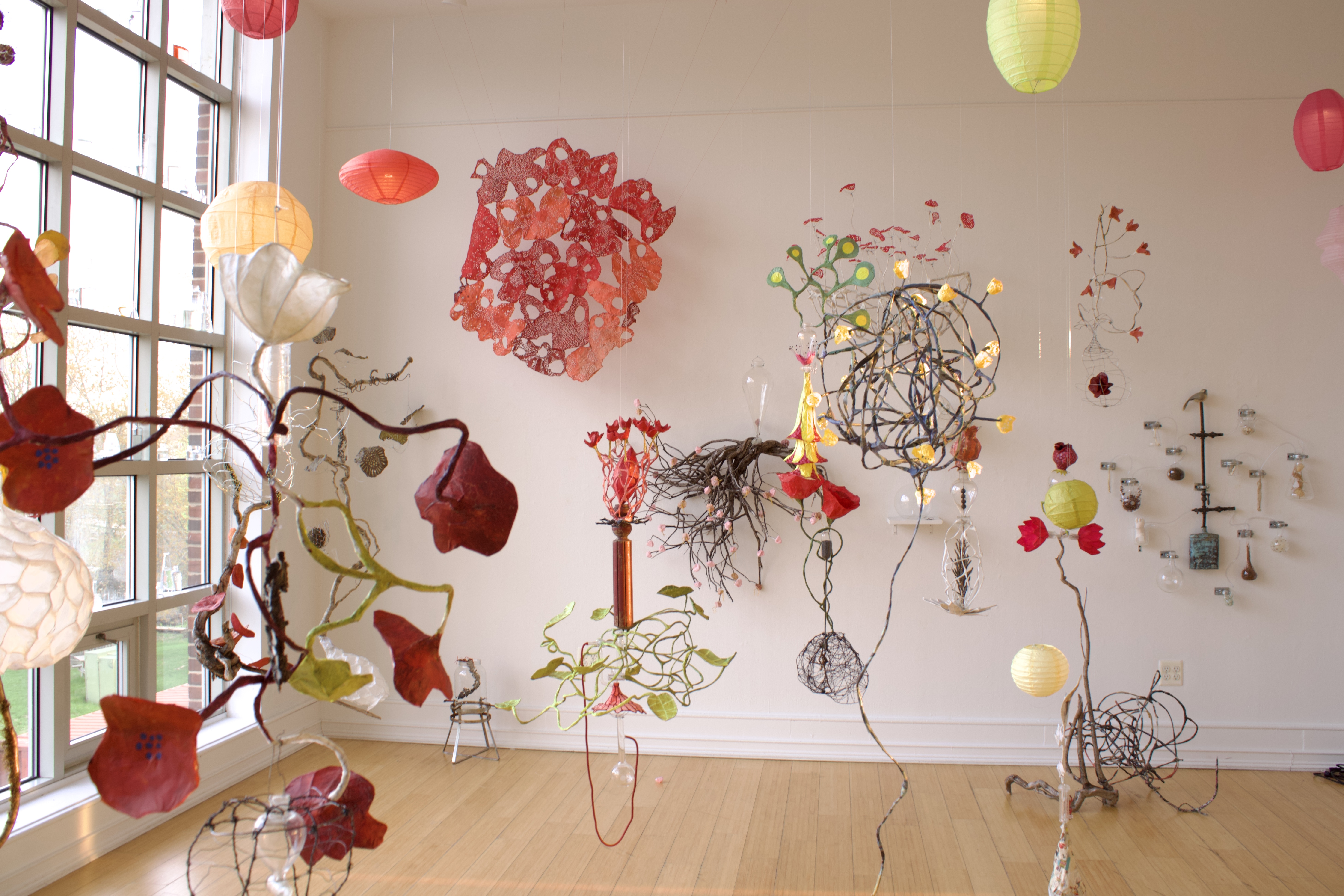 installation of chemistry glassware, water, wire, string, papier-mâché, found objects, paint, plants, paper lanterns, audio