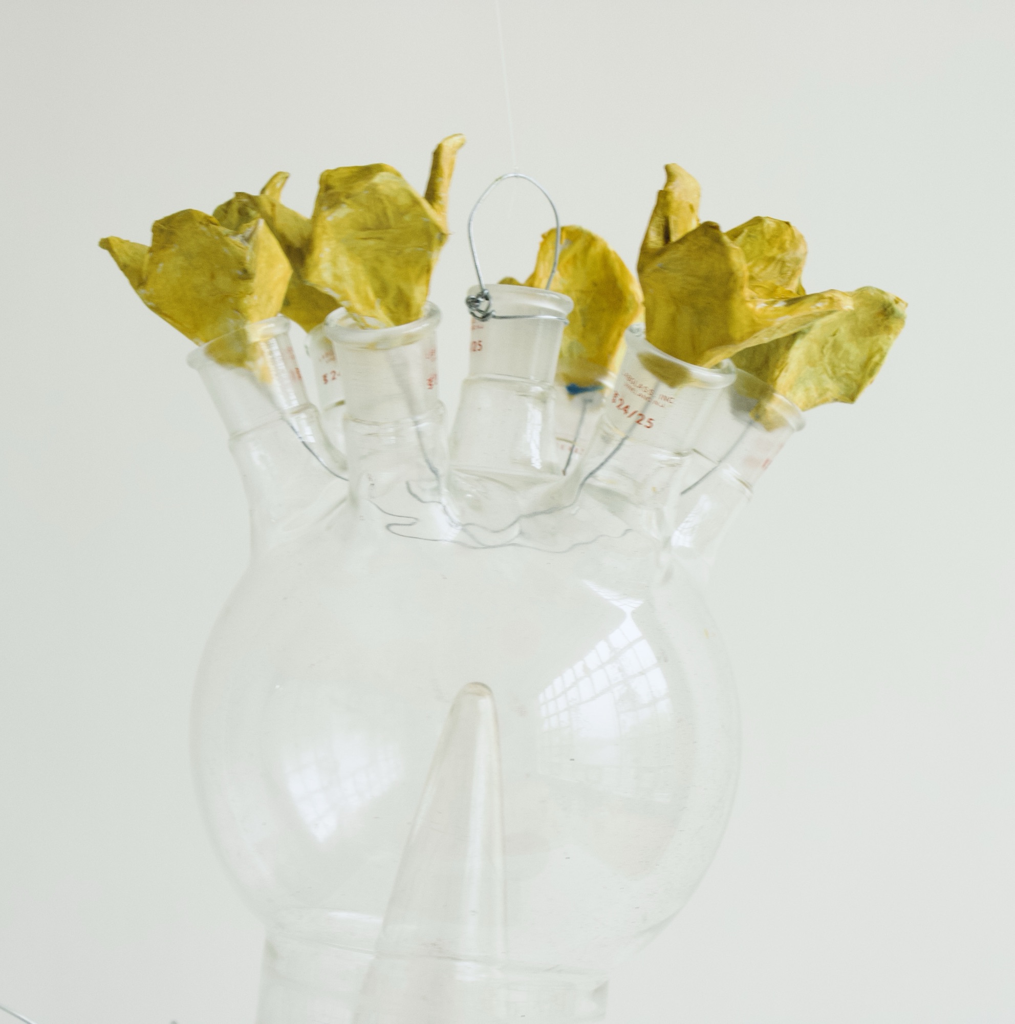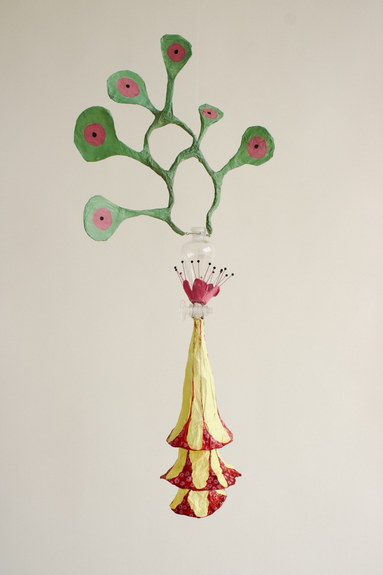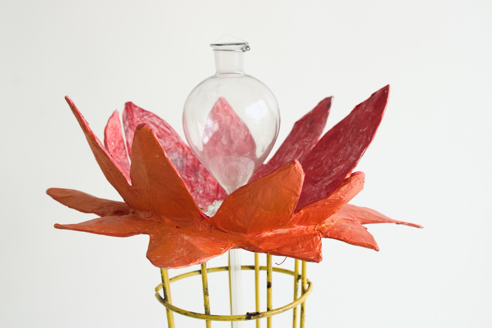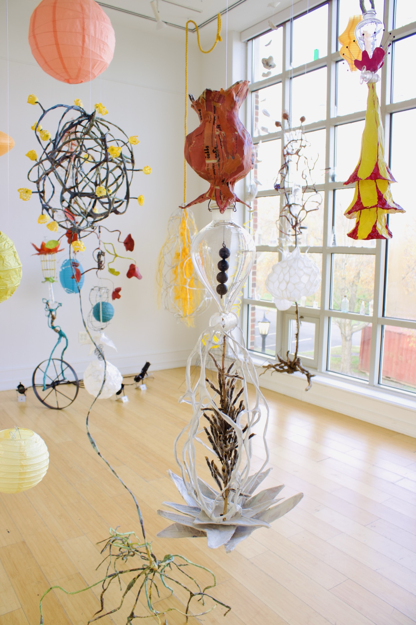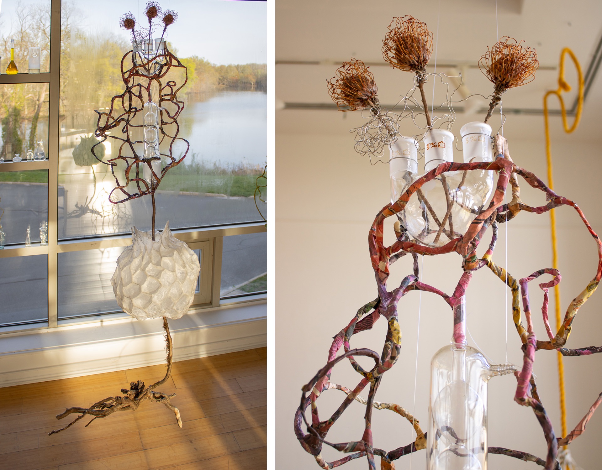 installation of chemistry glassware, water, wire, string, papier-mâché, found objects, paint, plants, paper lanterns, audio