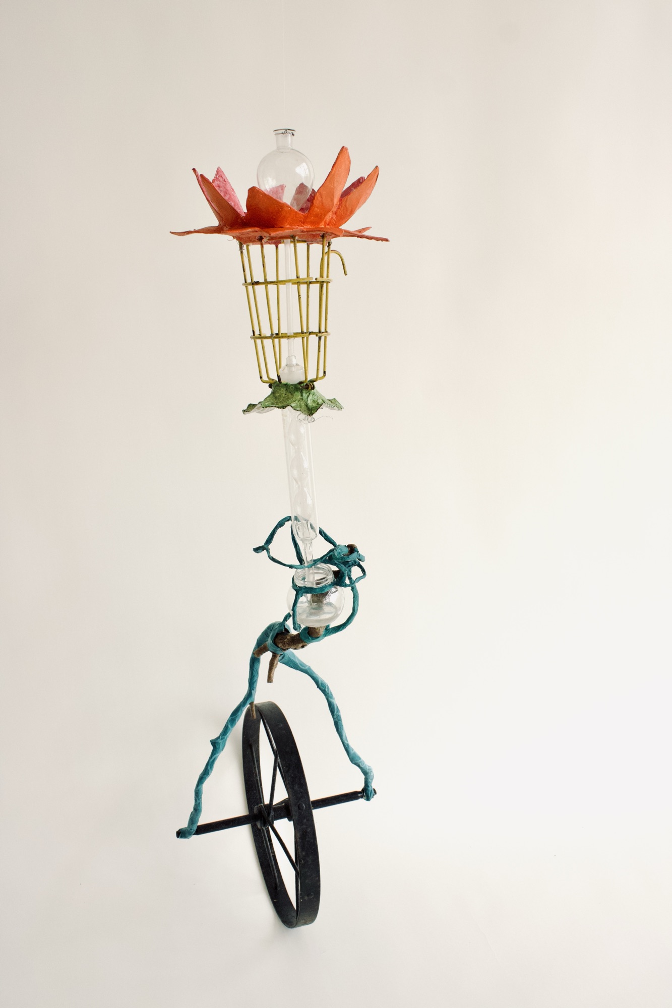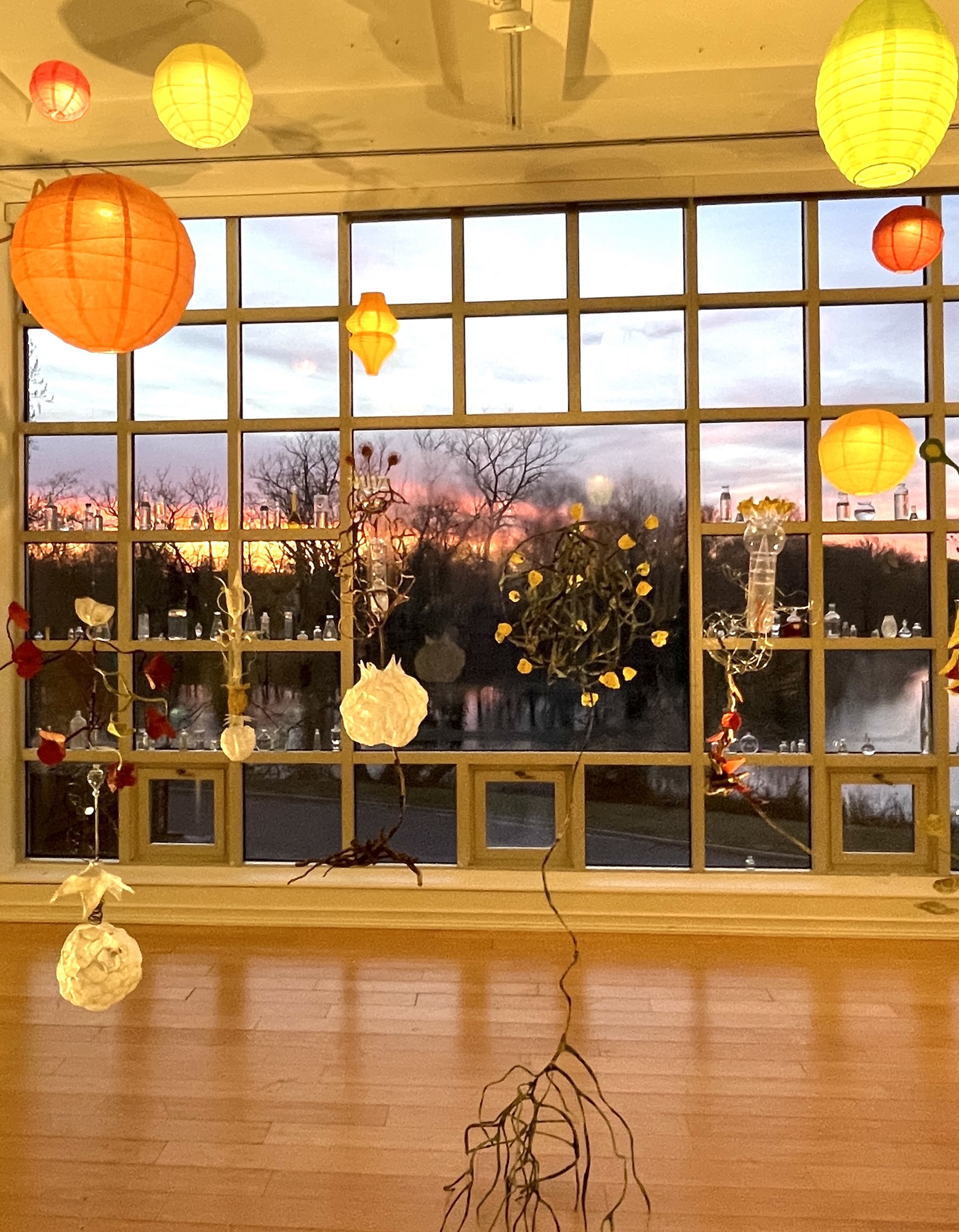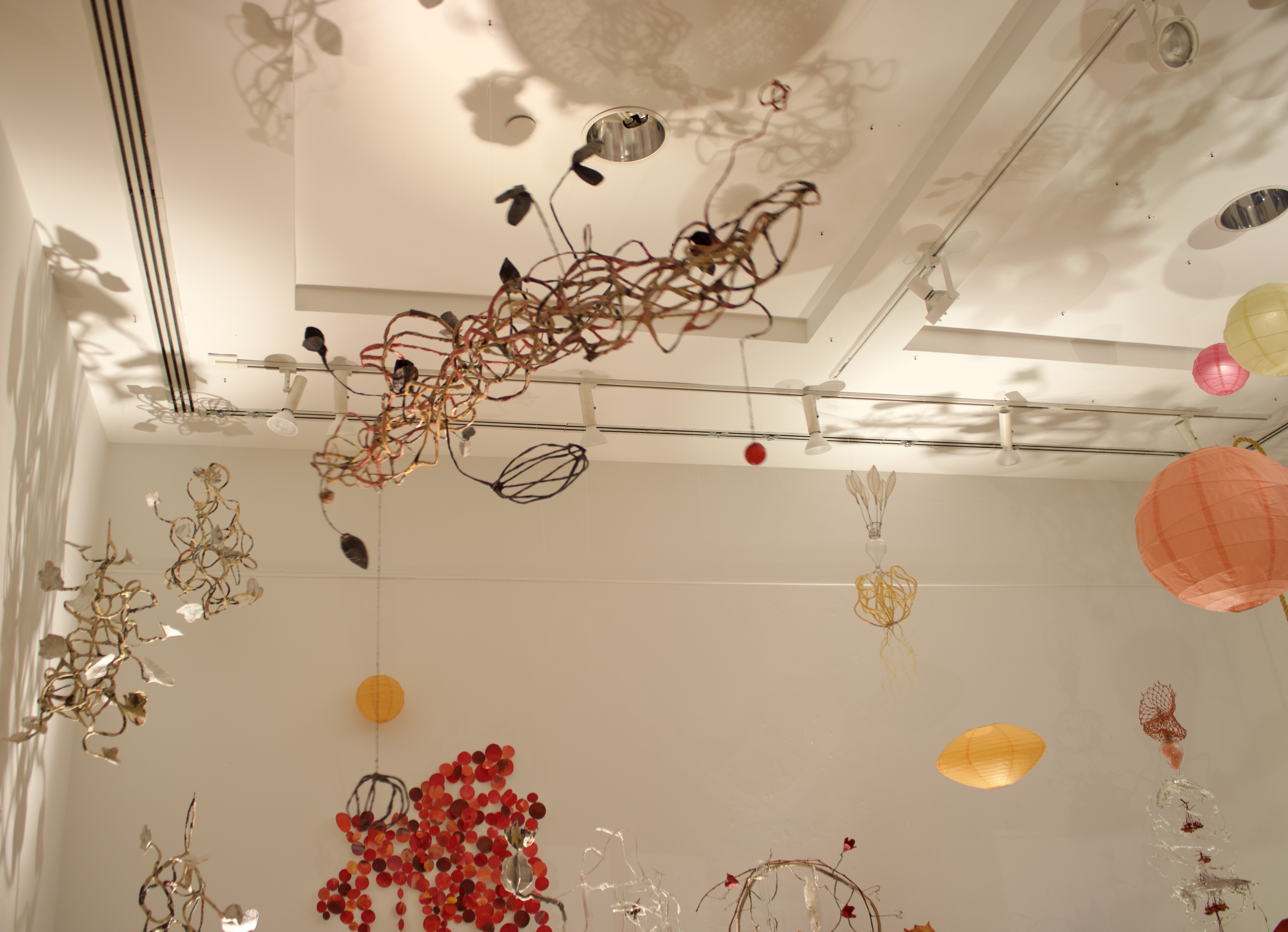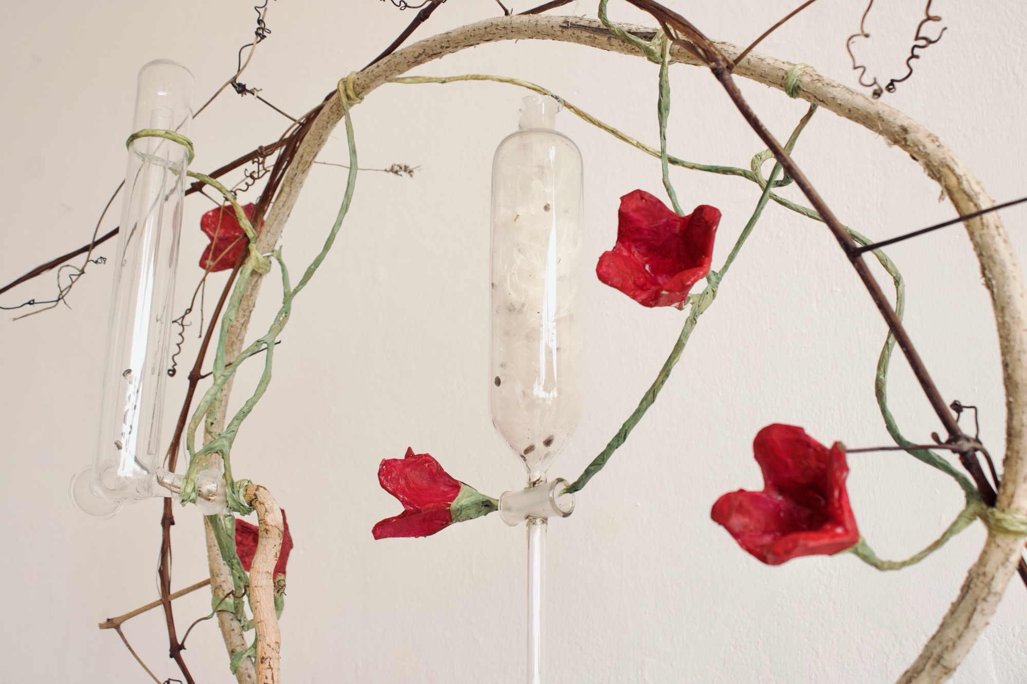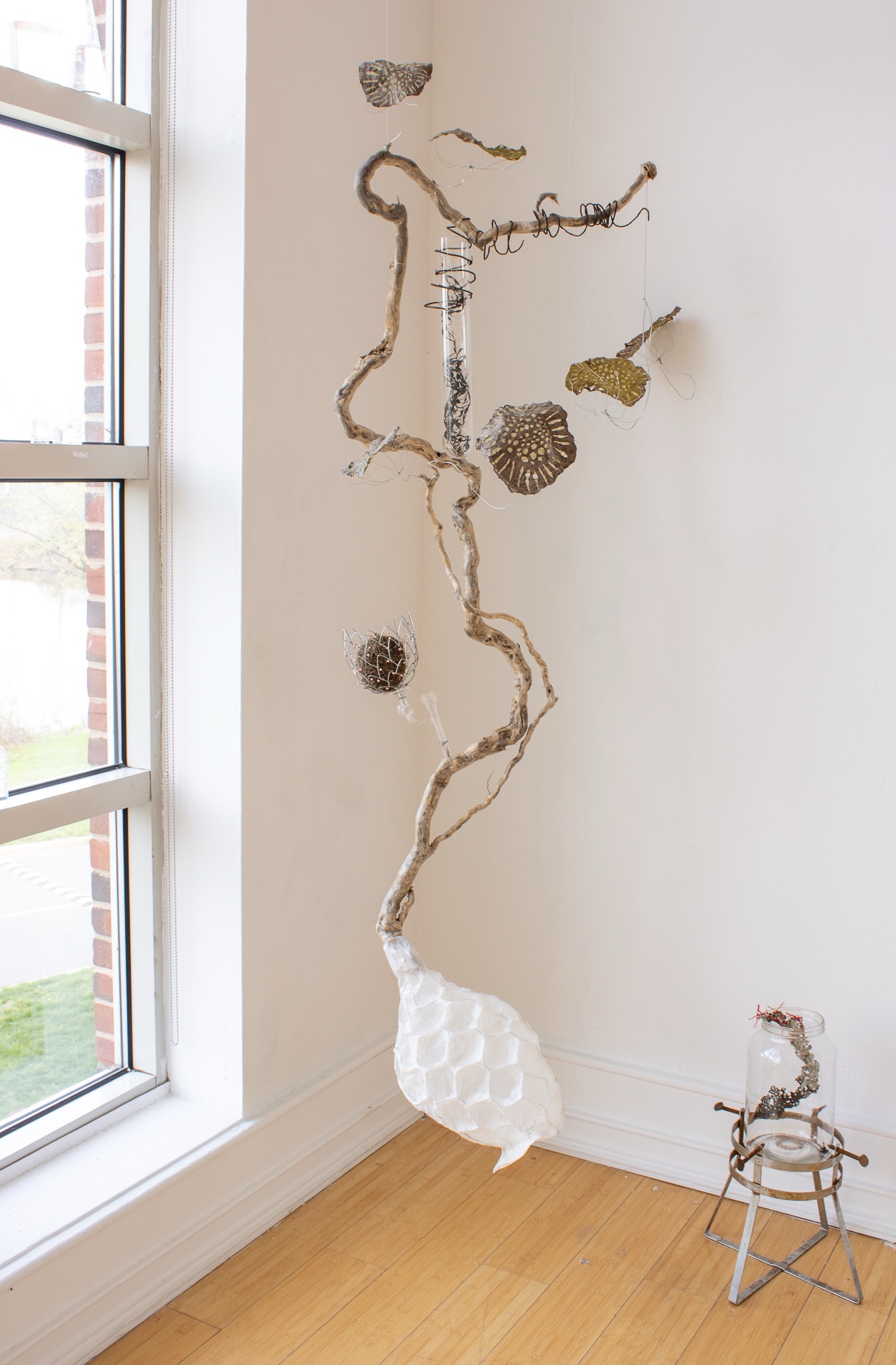 installation of chemistry glassware, water, wire, string, papier-mâché, found objects, paint, plants, paper lanterns, audio