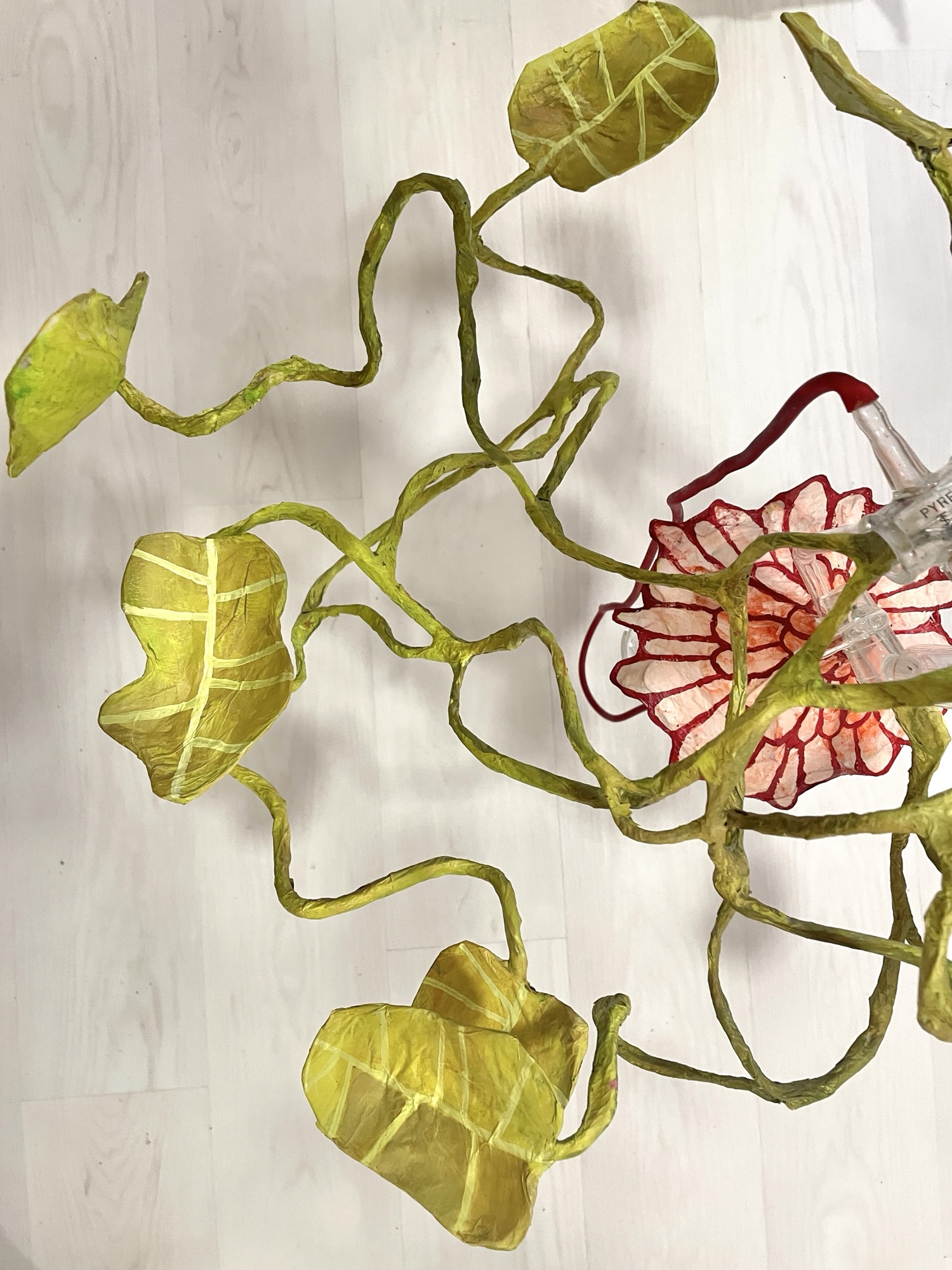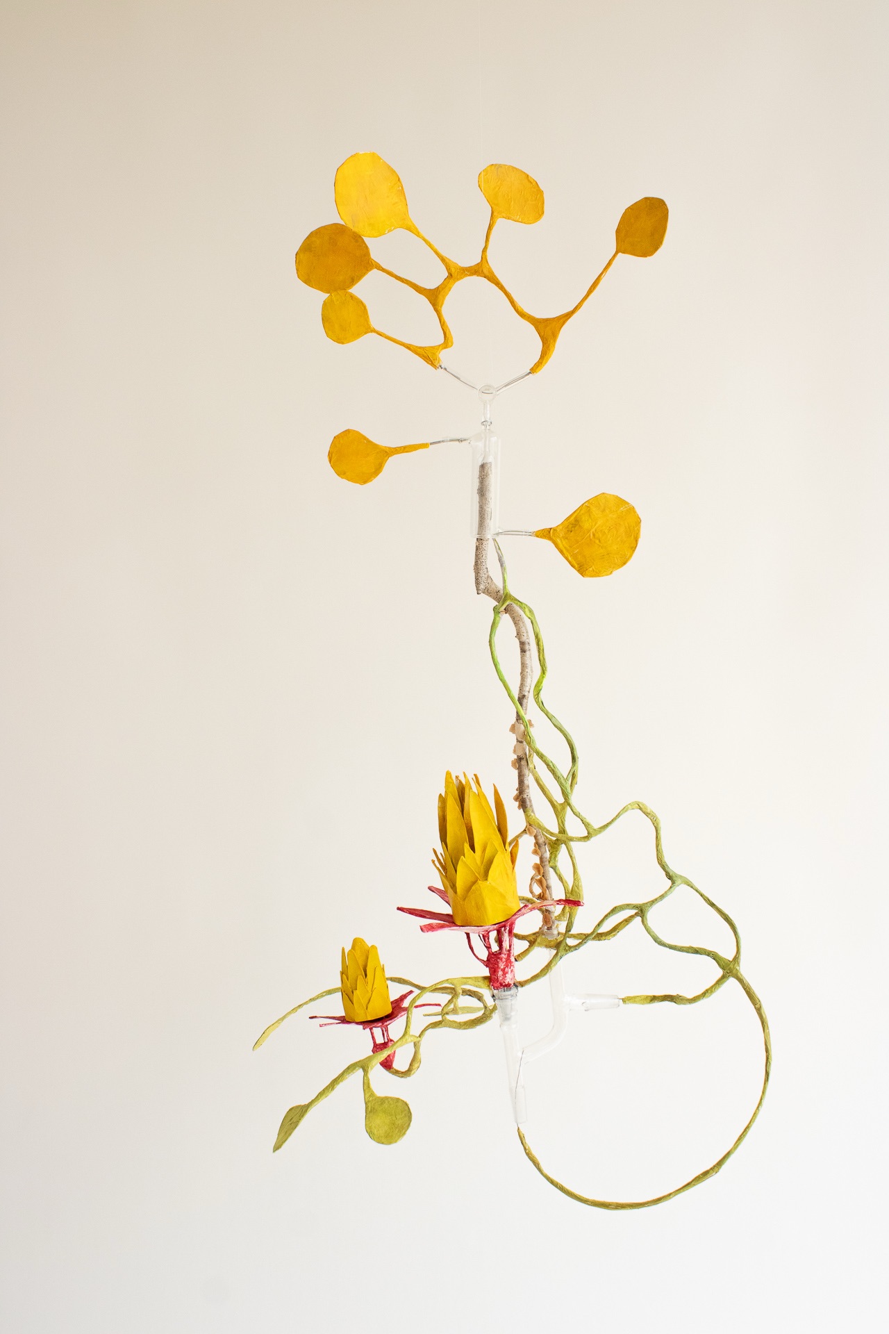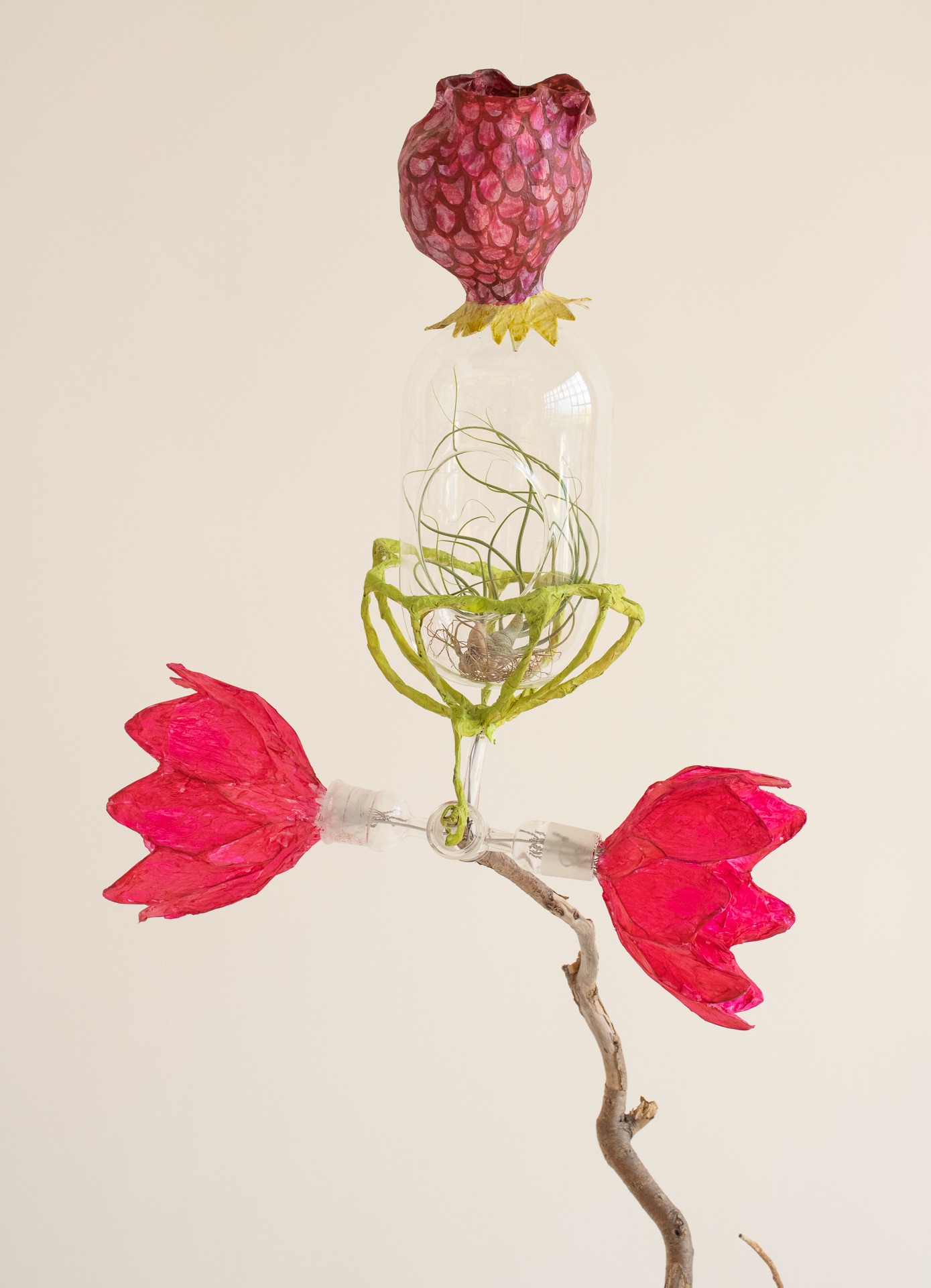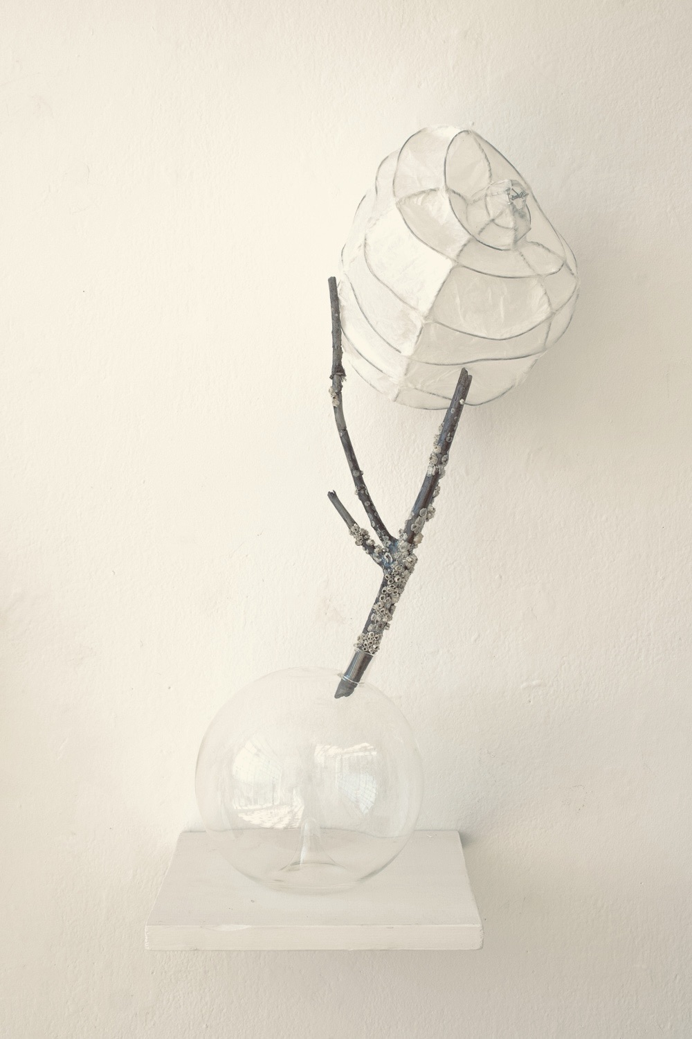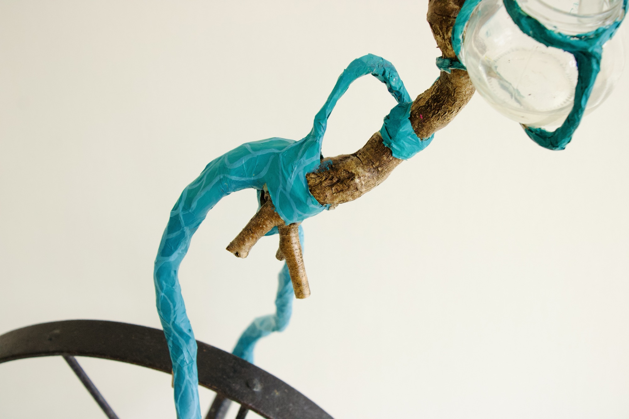 installation of chemistry glassware, water, wire, string, papier-mâché, found objects, paint, plants, paper lanterns, audio