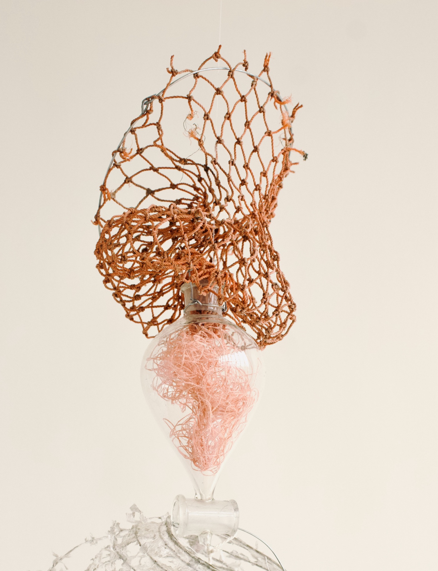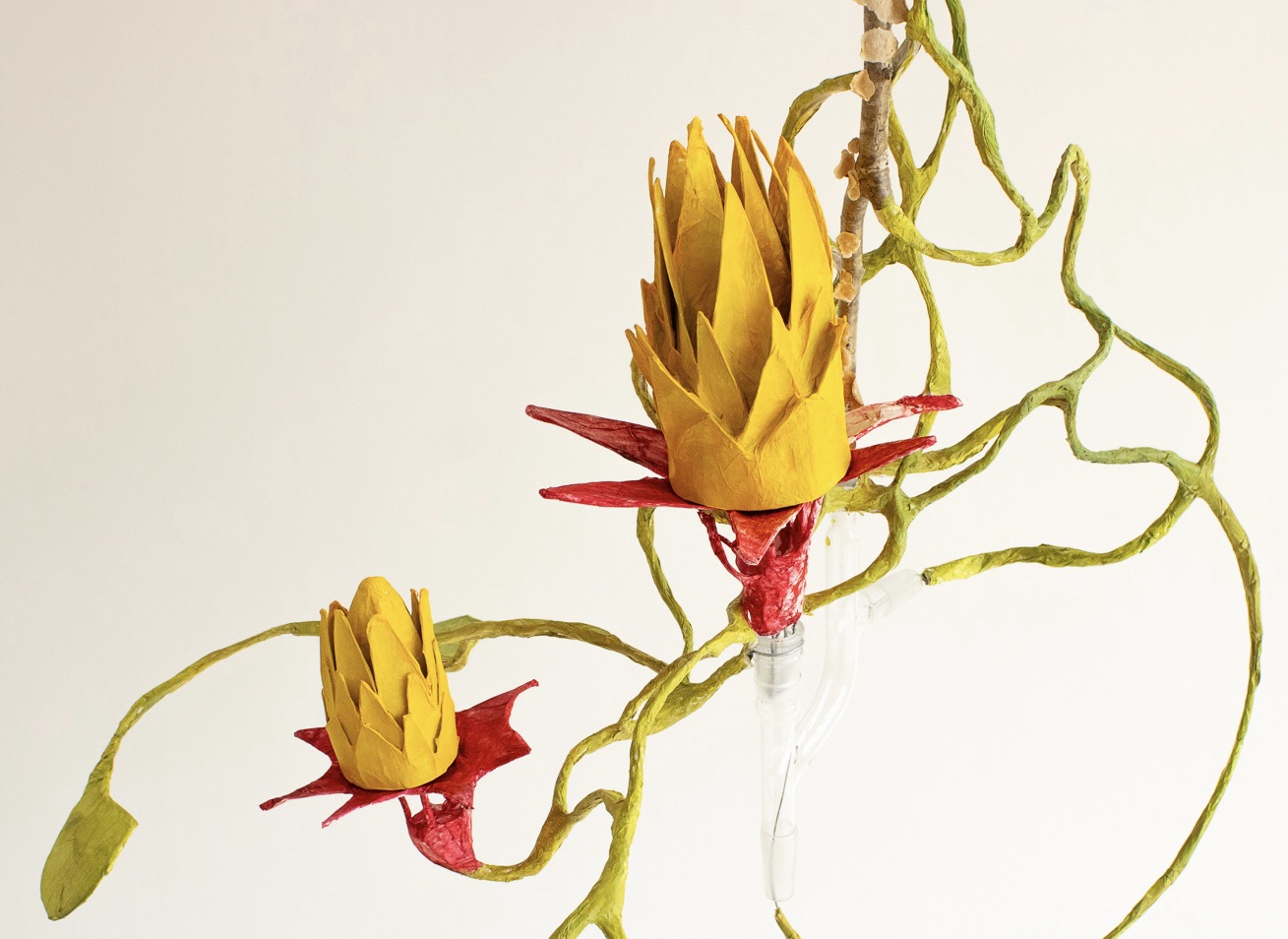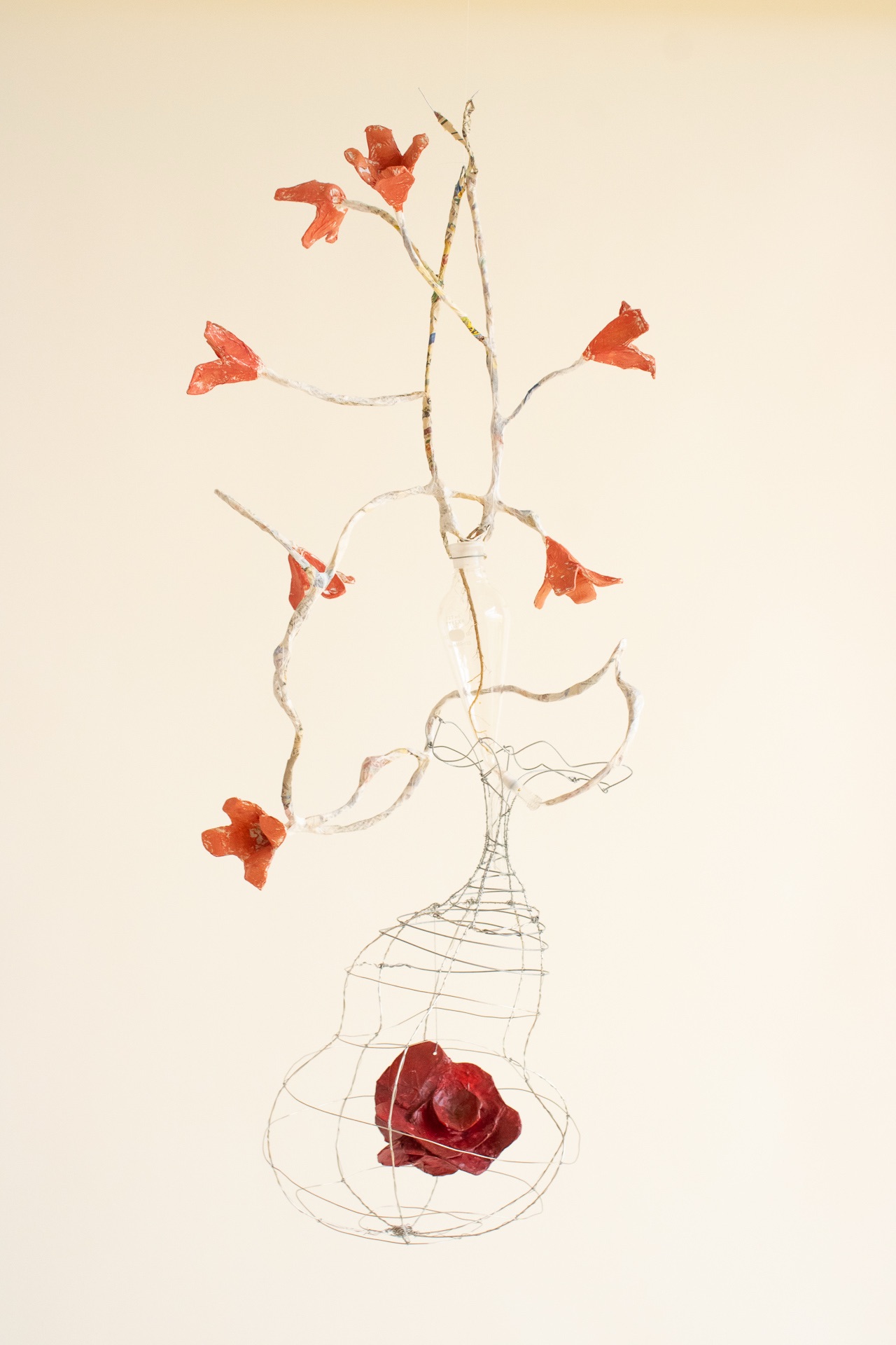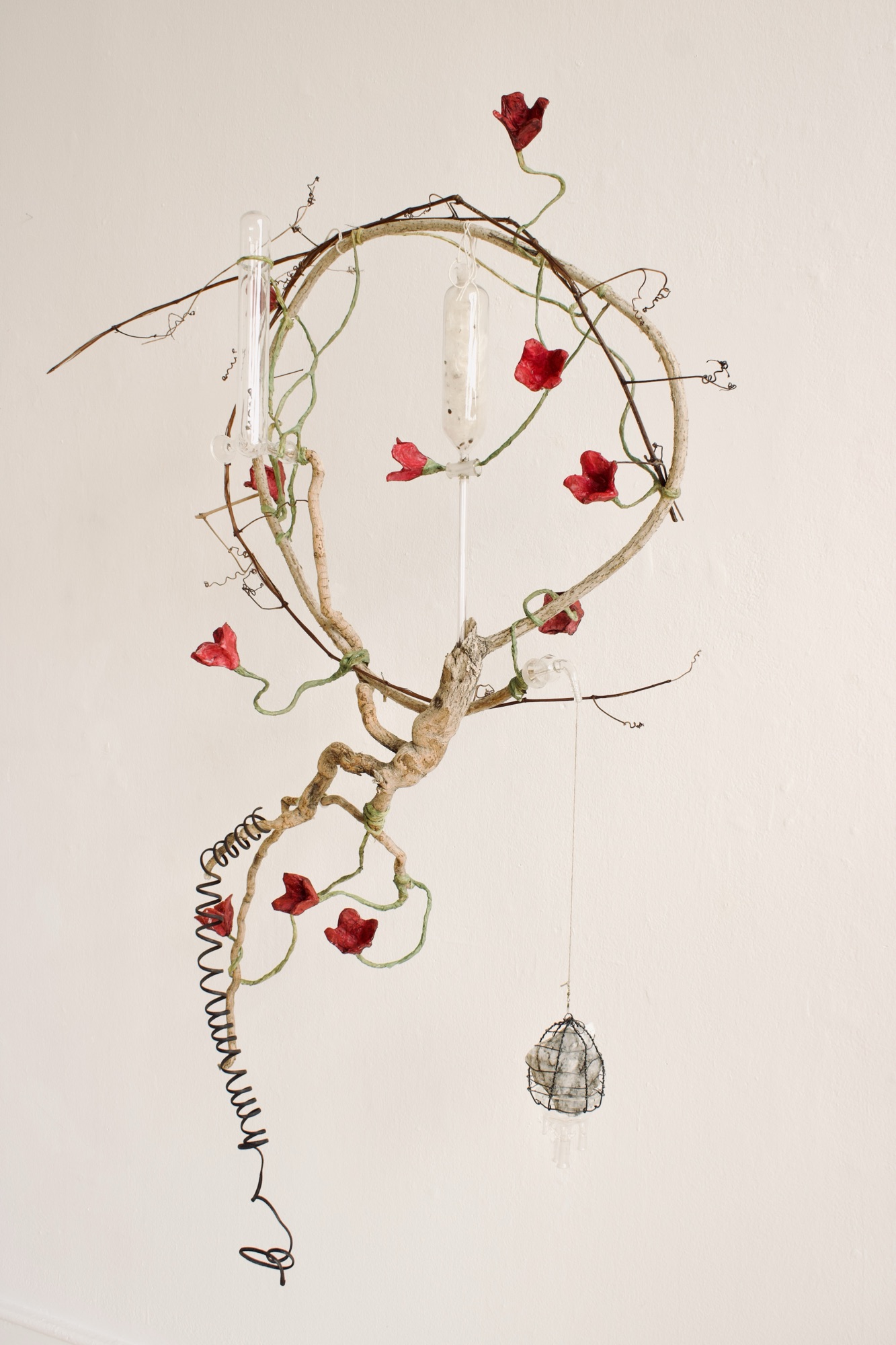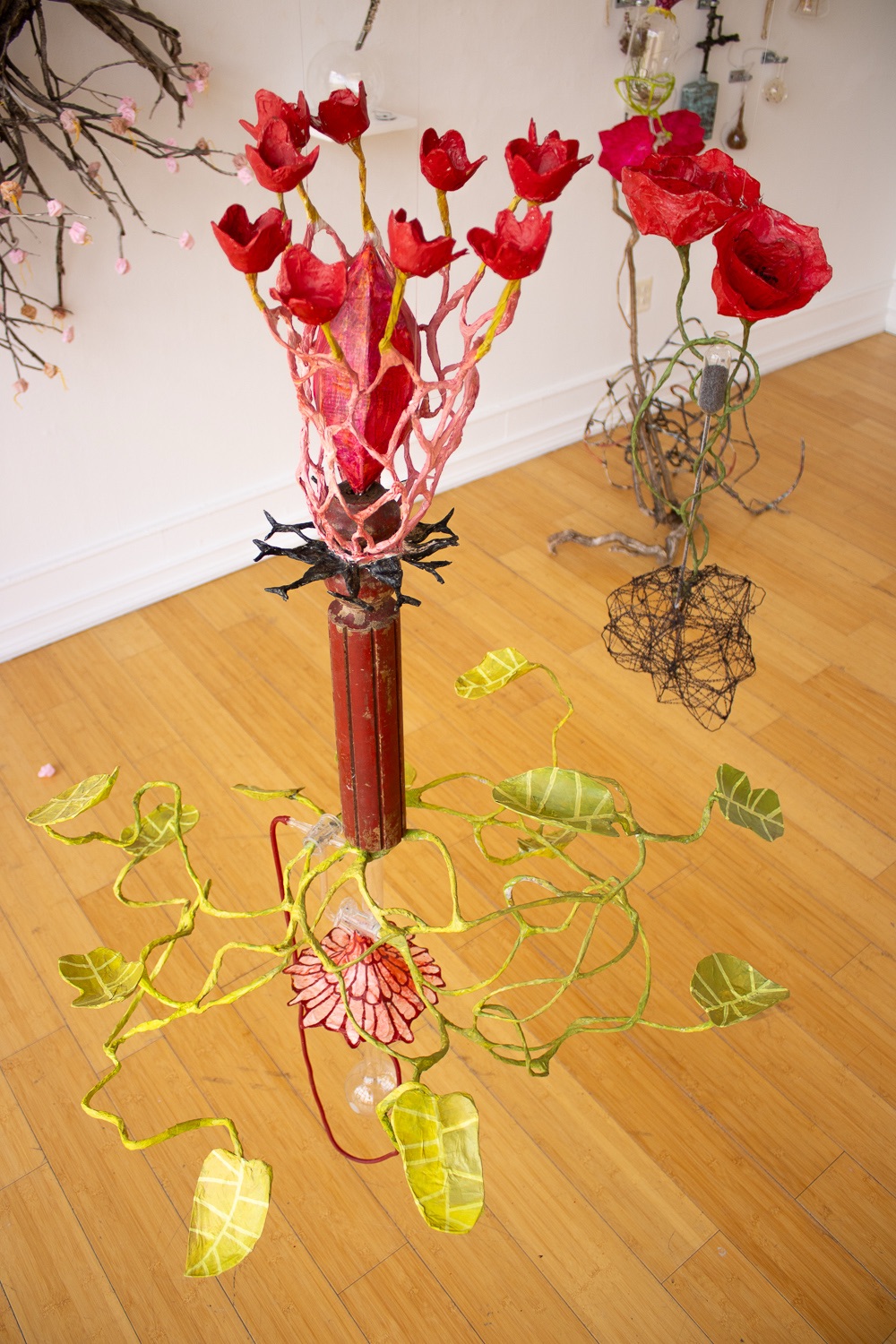 installation of chemistry glassware, water, wire, string, papier-mâché, found objects, paint, plants, paper lanterns, audio