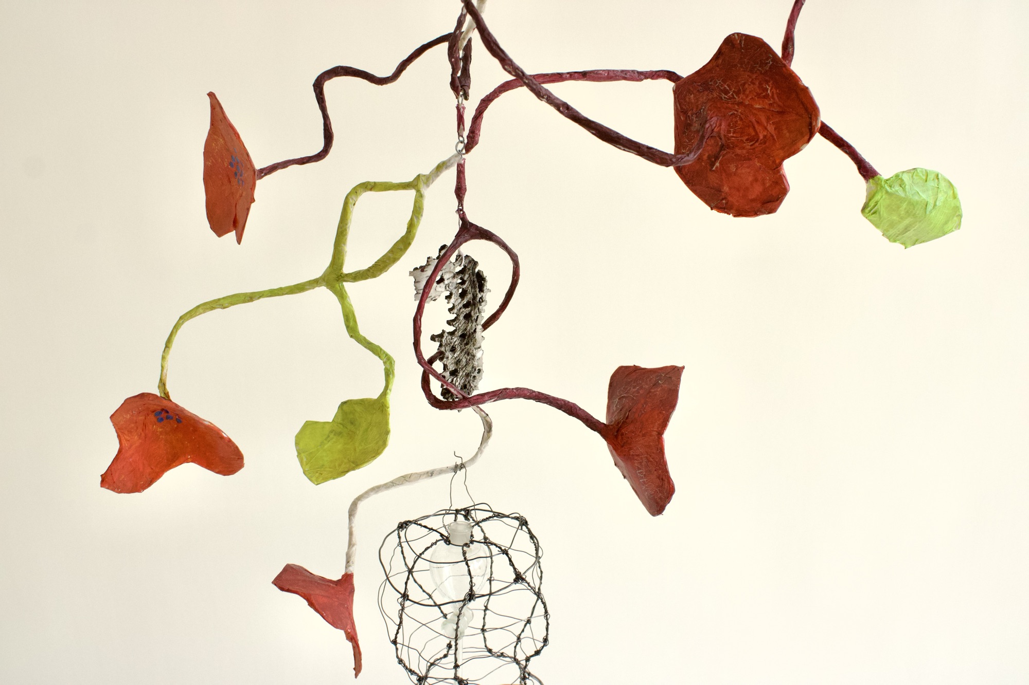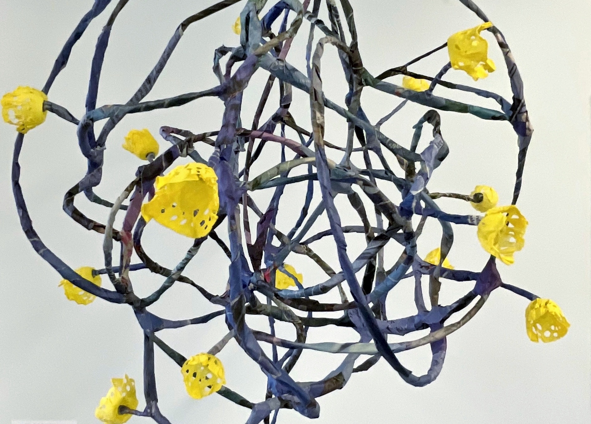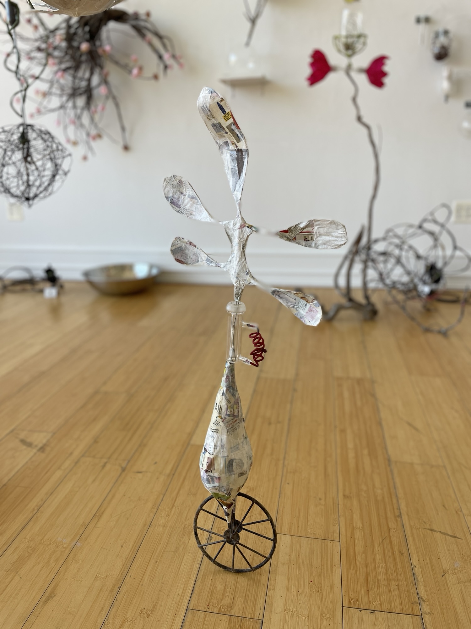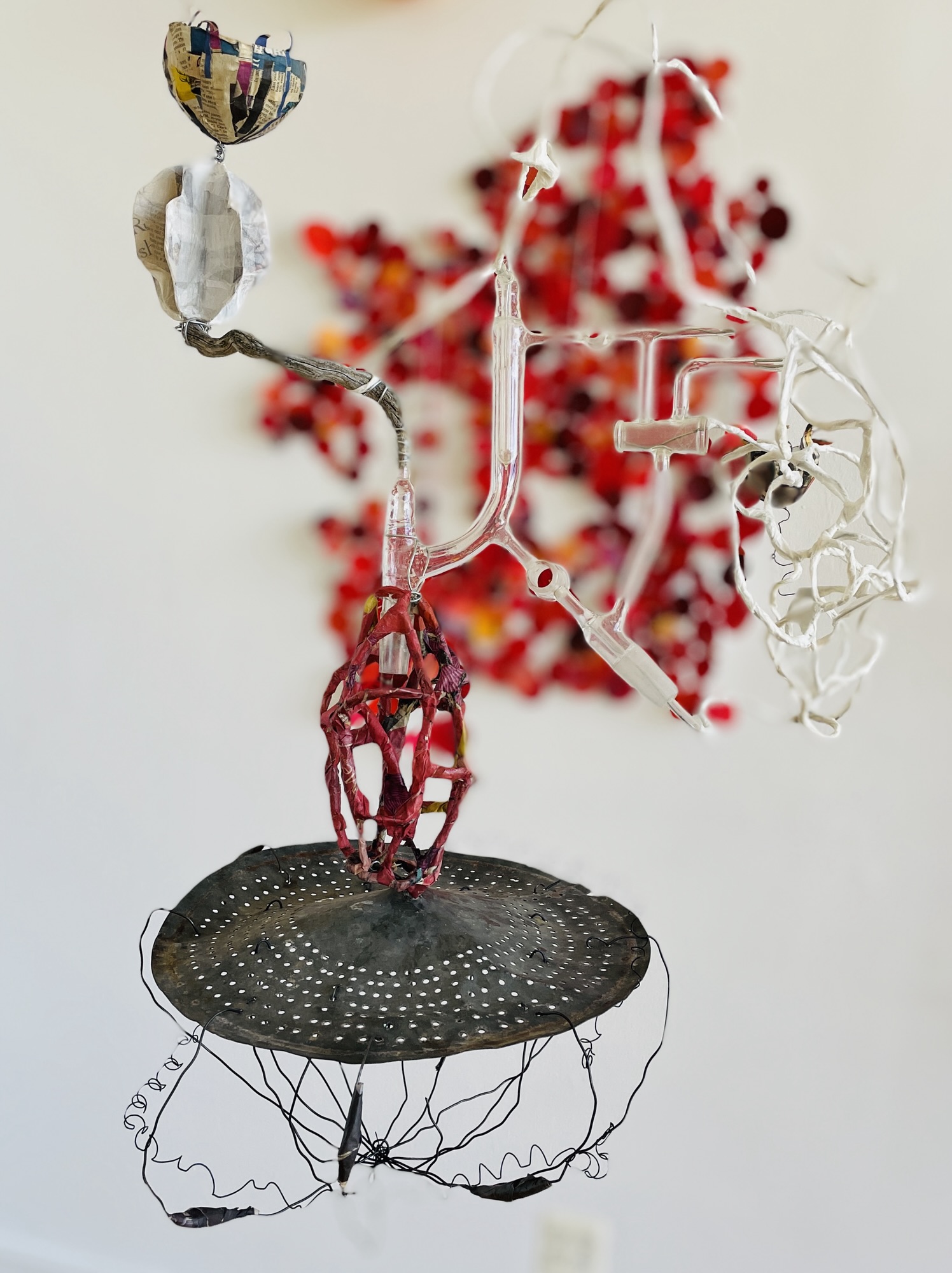 This is my most recent adventure, an exotic ecosystem, a gathering of foundlings, of hybrid creatures who borrow indiscriminately from the languages of poetry and science. They indulge my obsession with making something from nothing, my love affair with recycled newspaper, twigs, and wire… They are my antidote to the news, the embodiment of enduring hopefulness, an opportunity ‘maybe even to float a little above this difficult world.’ (Mary Oliver). When we go to sleep, I imagine that they flower and sing, and drip and dance the night away. They are having a party to which you are invited.